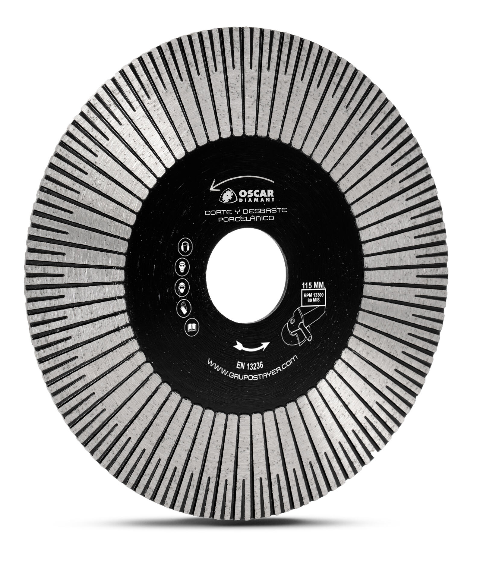 Disco para cortes de: Porcelanánico, cerámica, gres, terrazo y granito. Fácil corte a 45° con el mayor grosor de la plancha y el recubrimiento diamantado. Permite repasar y achaflanar el corte para obtener un acabado perfecto. 115mm diámetro.