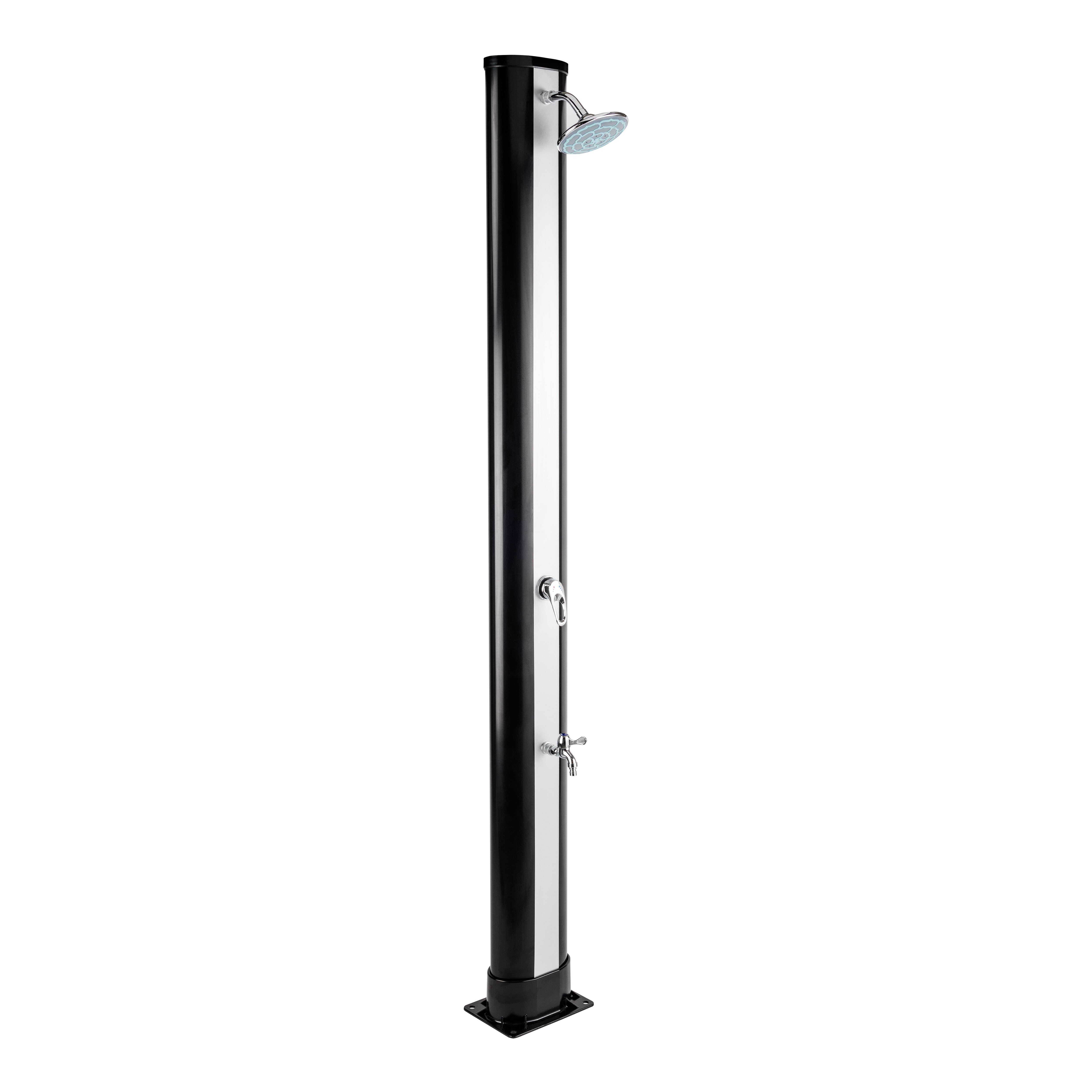 Ducha Solar con depósito de 35L , cuerpo de ducha en PVC. Instalación rápida (por pletina y tornillos). Grifos monomando para agua caliente y fría. Lavapiés incluido. Rociador orientable y regulable. Tapón de vaciado. Dimensiones : 233 cm x 21 cm x 27 cm. Peso 15 Kg.