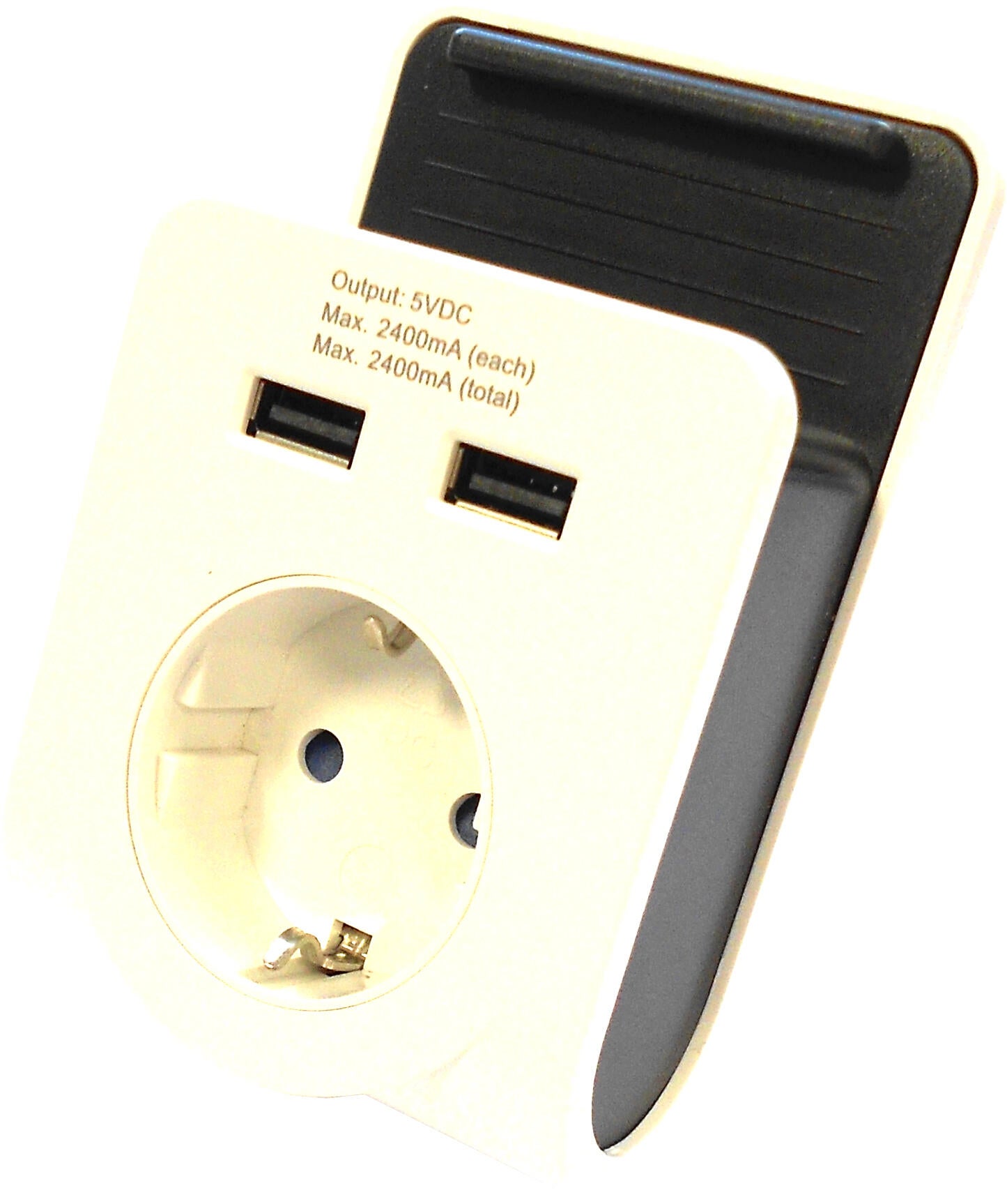 Ver productos de la misma categoríaBase de enchufe schuko con 2 tomas usb y soporte para telefono movil. ideal para la recarga de varios dispositivos dejando libre el enchufe.