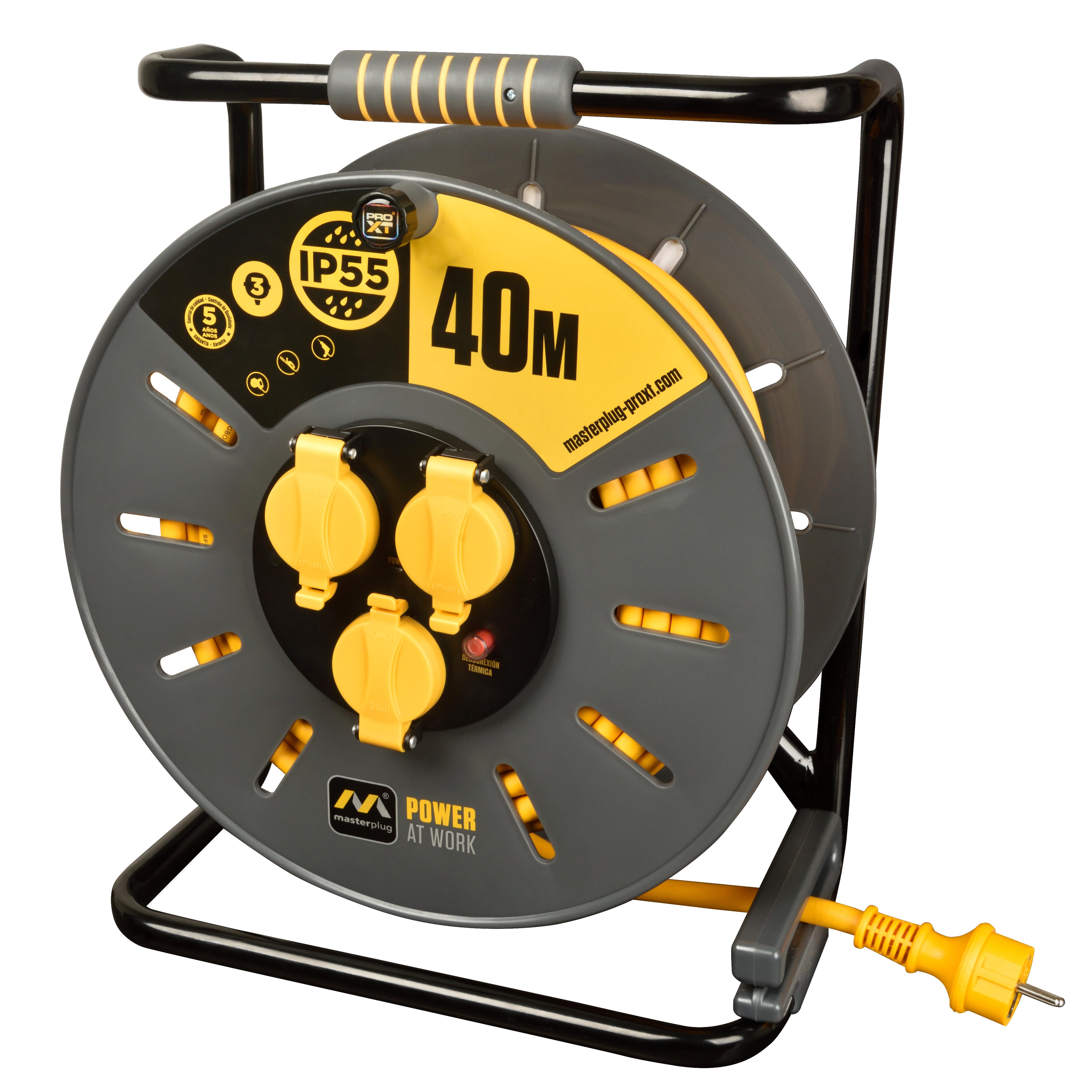 Enrollacable de exterior con 3 tomas de enchufe de 2polos + tierra 16a con tapa, y un cable de 3x1.5mm2 de seccion y una longitud de 40 metros, cable del tipo h05rr-f. Dispone de disyuntor de corte de seguridad e interruptor de encendido/apagado.