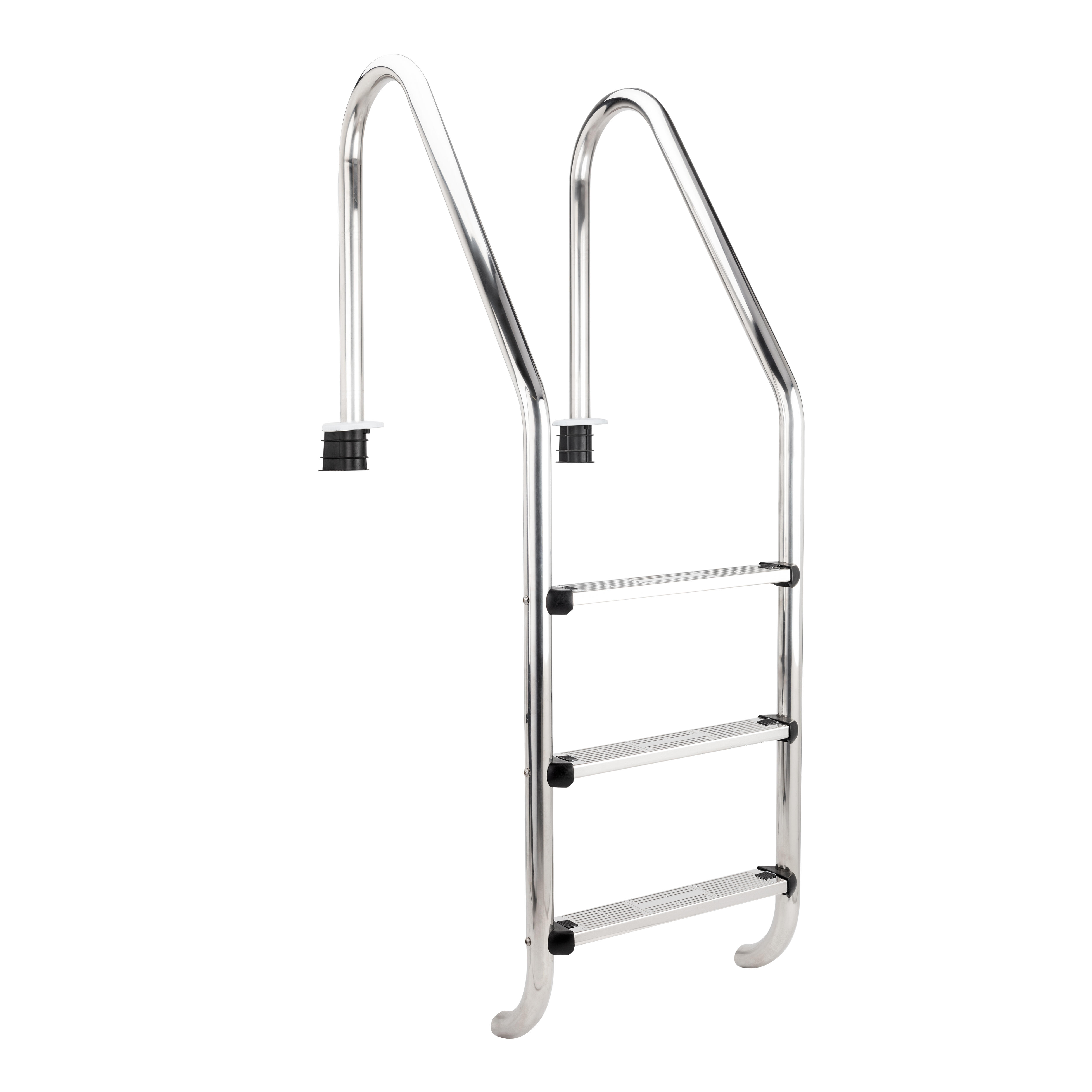 Fabricada en tubo de 43 mm de diámetro de acero inoxidable, de 500 mm de ancho. Se suministra con topes inferiores de plástico y anclaje de fijación. Peldaños anchos (500 mm), cómodos y seguros para la entrada a la piscina.