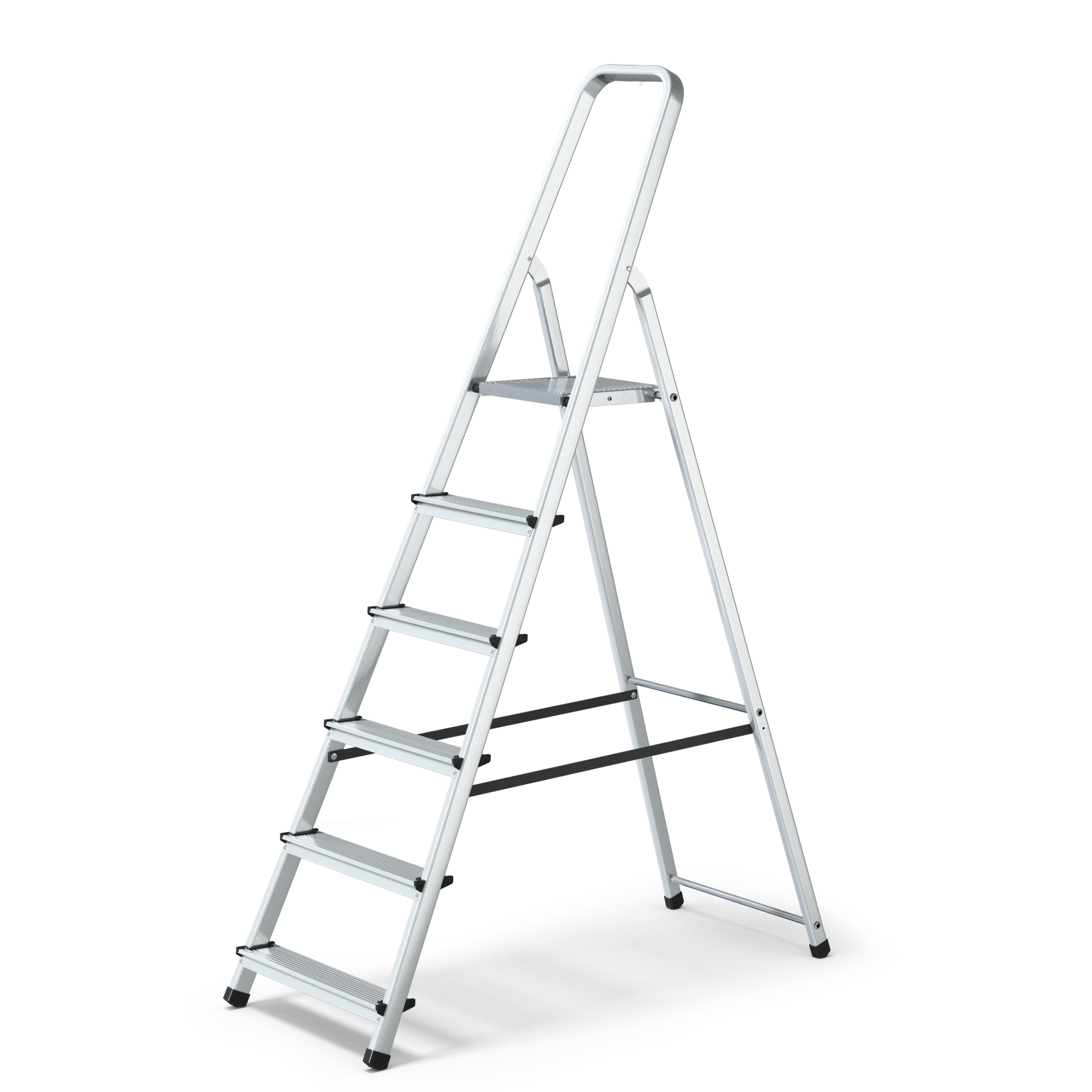 Escalera de aluminio de 6 peldaños. Carga máx 125 Kg. Peso 4,2Kg. Altura máx de trabajo: 3,18m.