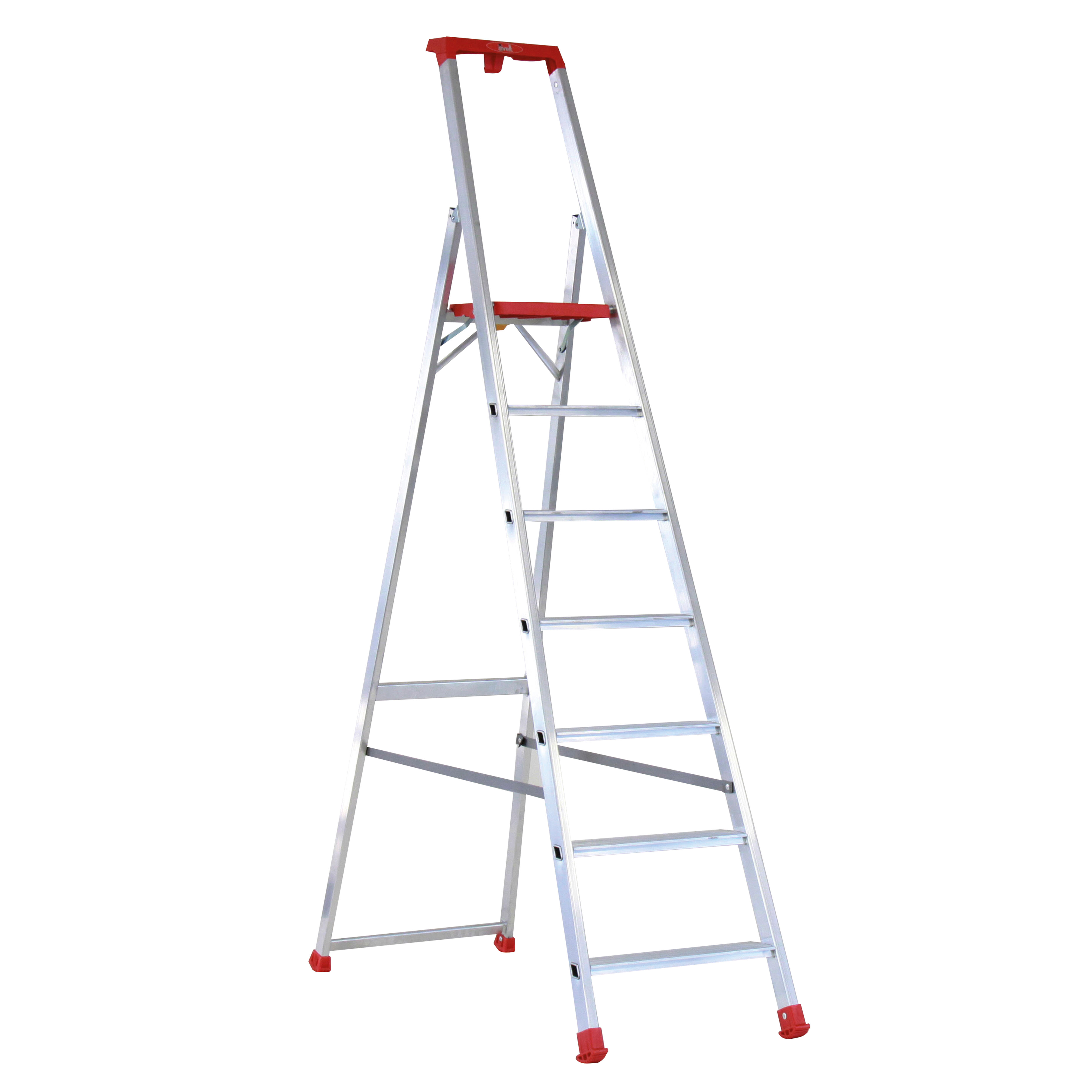 Escalera doméstica de aluminio de 7 peldaños. Carga máxima de 150Kg. Peso 7,8Kg. Altura máx de trabajo: 3,58m.