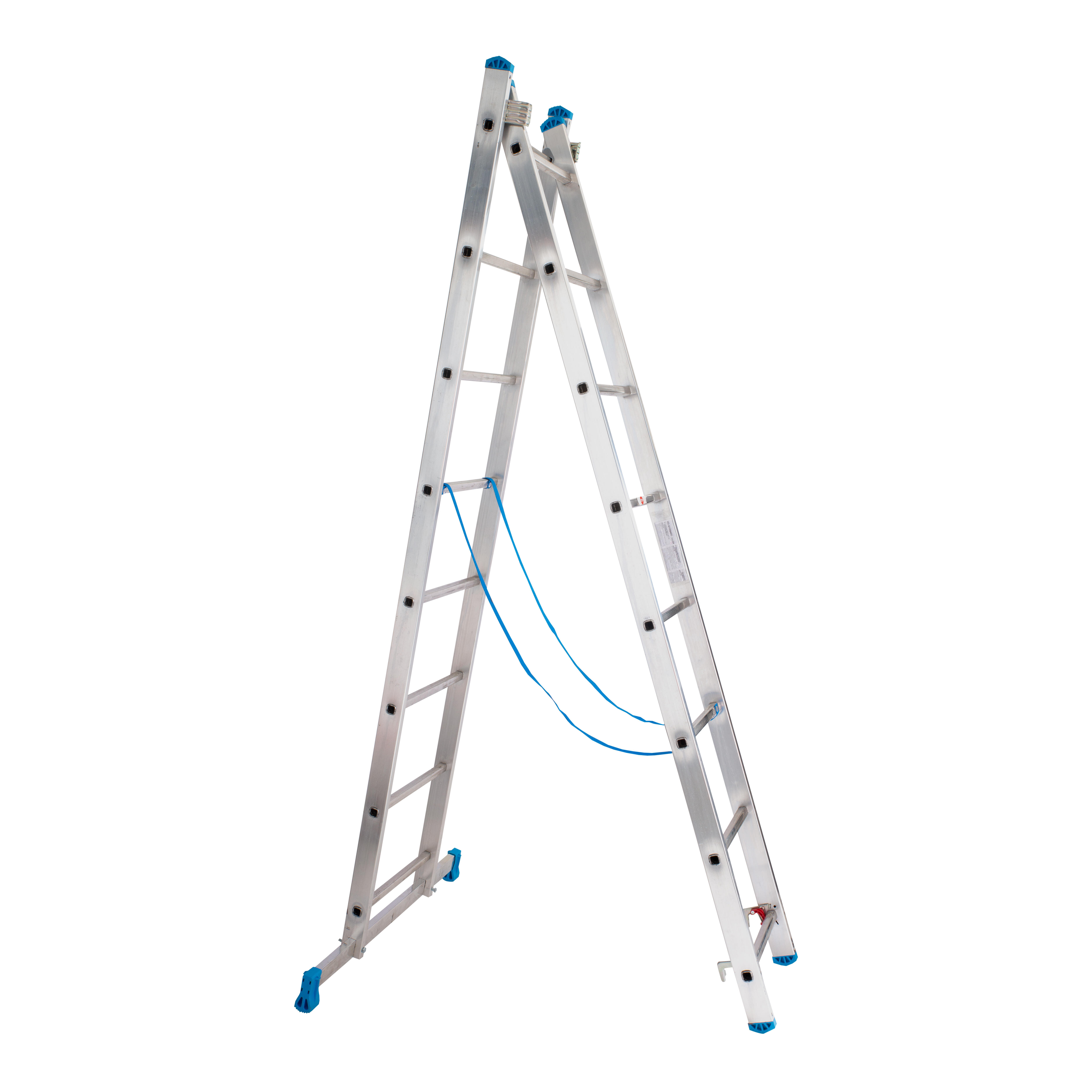 Escalera metálica transformable de aluminio 8+8 peldaños. Altura máxima de trabajo de 4,57m para un uso doméstico.