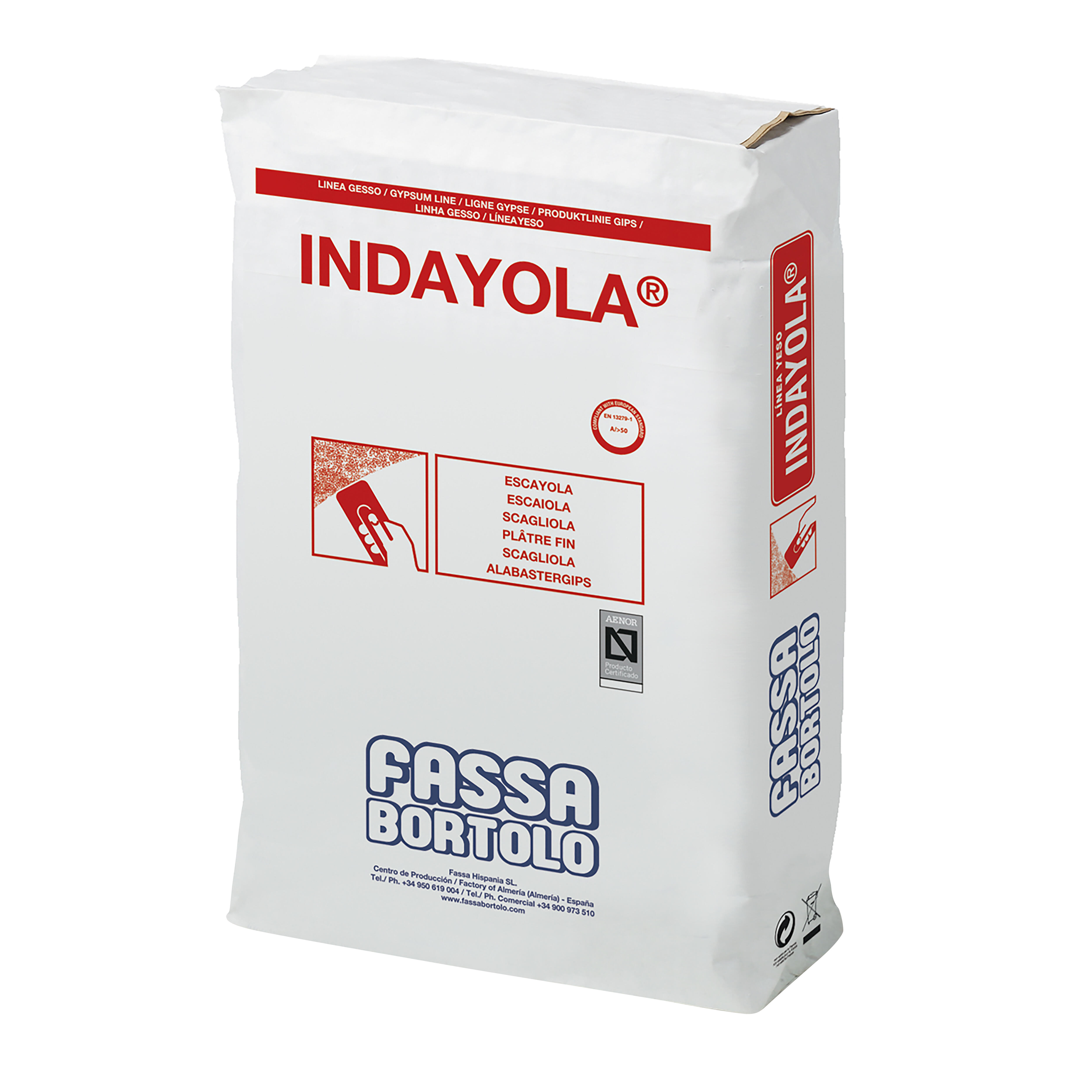 Escayola de grano muy fino INDAYOLA para acabados de blancura elevada y perfección. Indicada para realización de elementos prefabricados de escayola y trabajos de repaso y acabado. Alta resistencia mecánica. Saco de 25 kg.