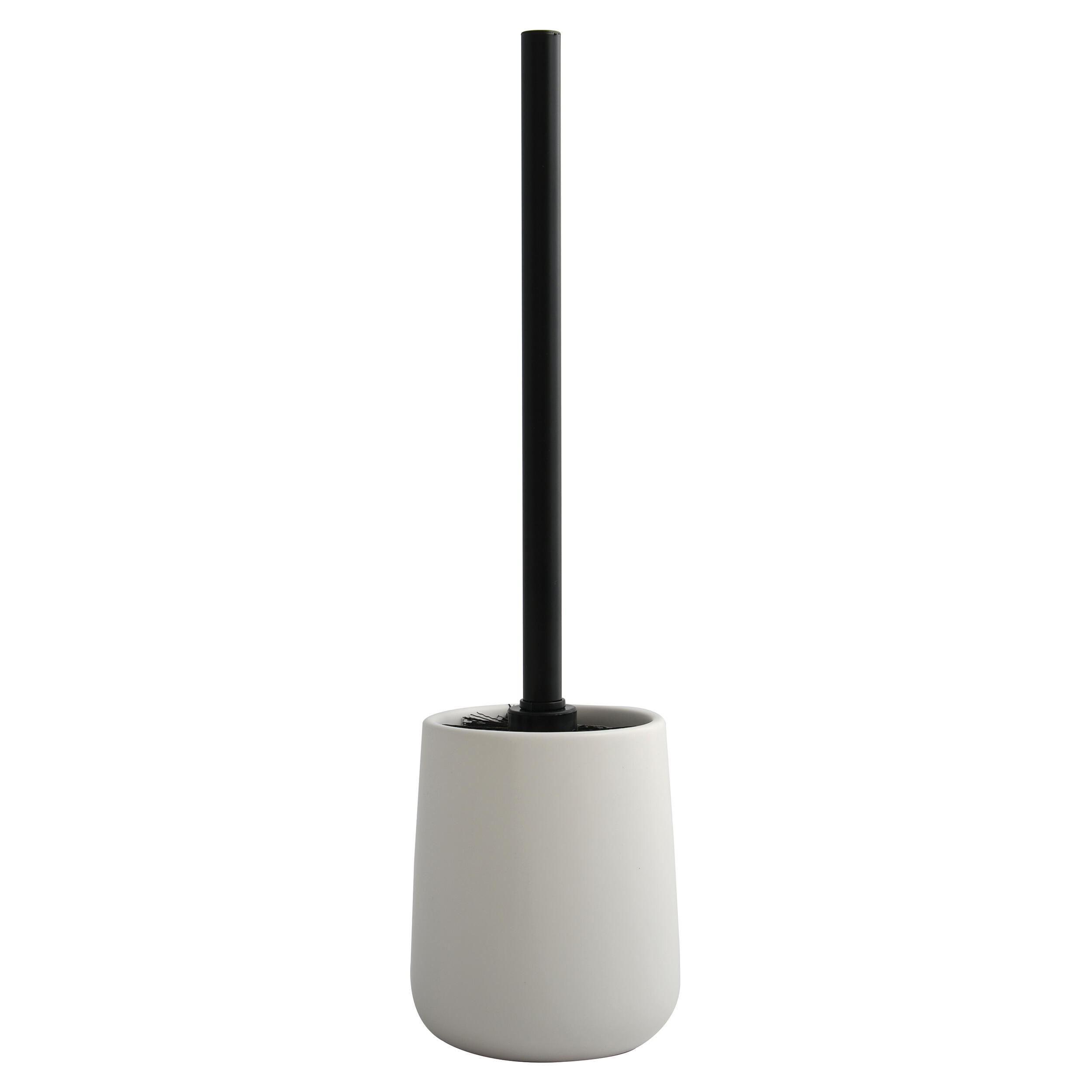 Escobillero fabricado en porcelana, de color blanco. La escobilla está equipada con cerdas resistentes al desgaste.