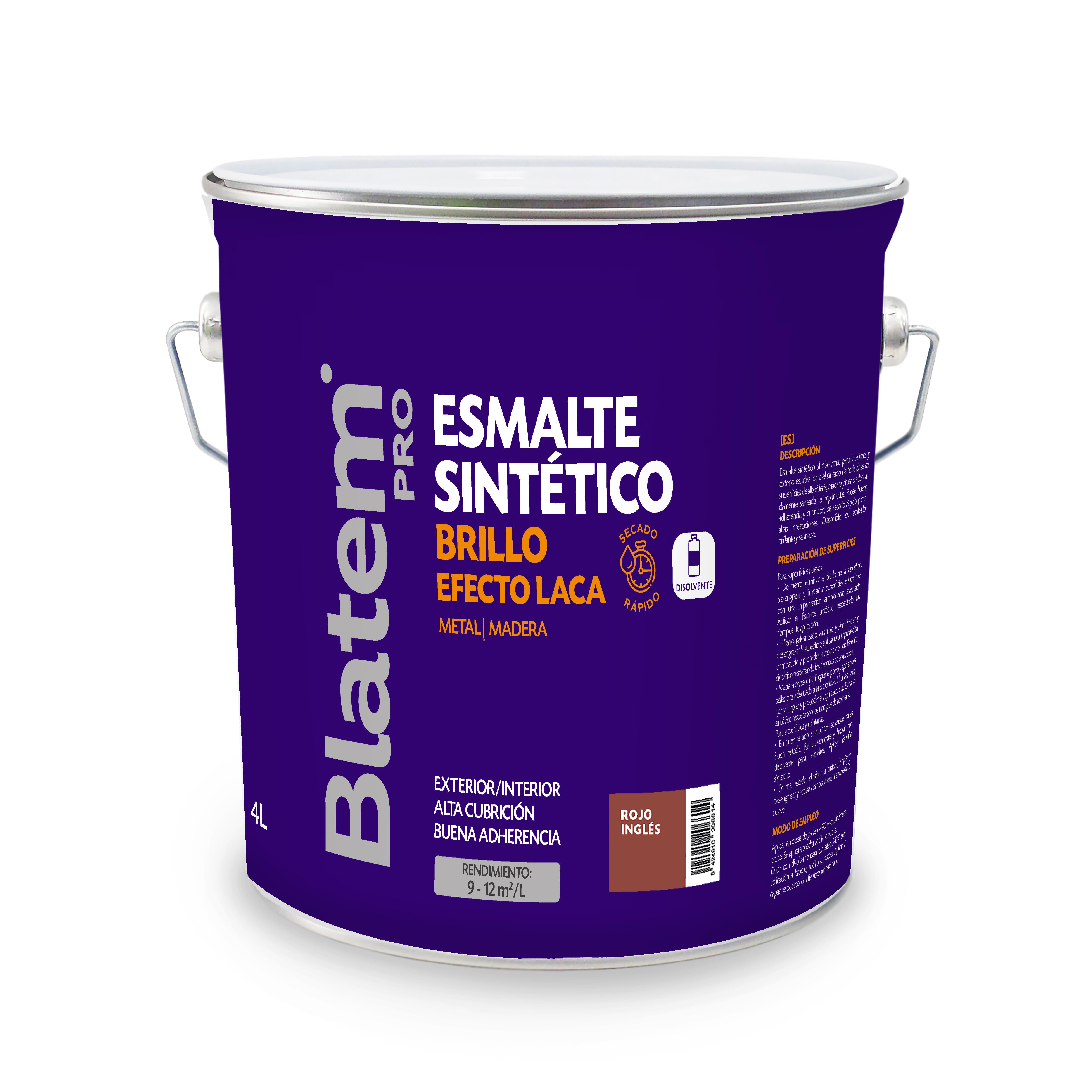 Esmalte sintético al disolvente de uso interioy exterior, adecuado para el pintado de toda clase de superficies de albañilería, madera y hierro adecuadamente saneadas e imprimadas • Rendimiento: 9-12 m2/l • Secado al tacto: 1,5-4 horas • Repintado: 18-24 horas • Buena adherencia • Alta cubrición • Secado rápido • Acabado antioxidante • Acabado brillante