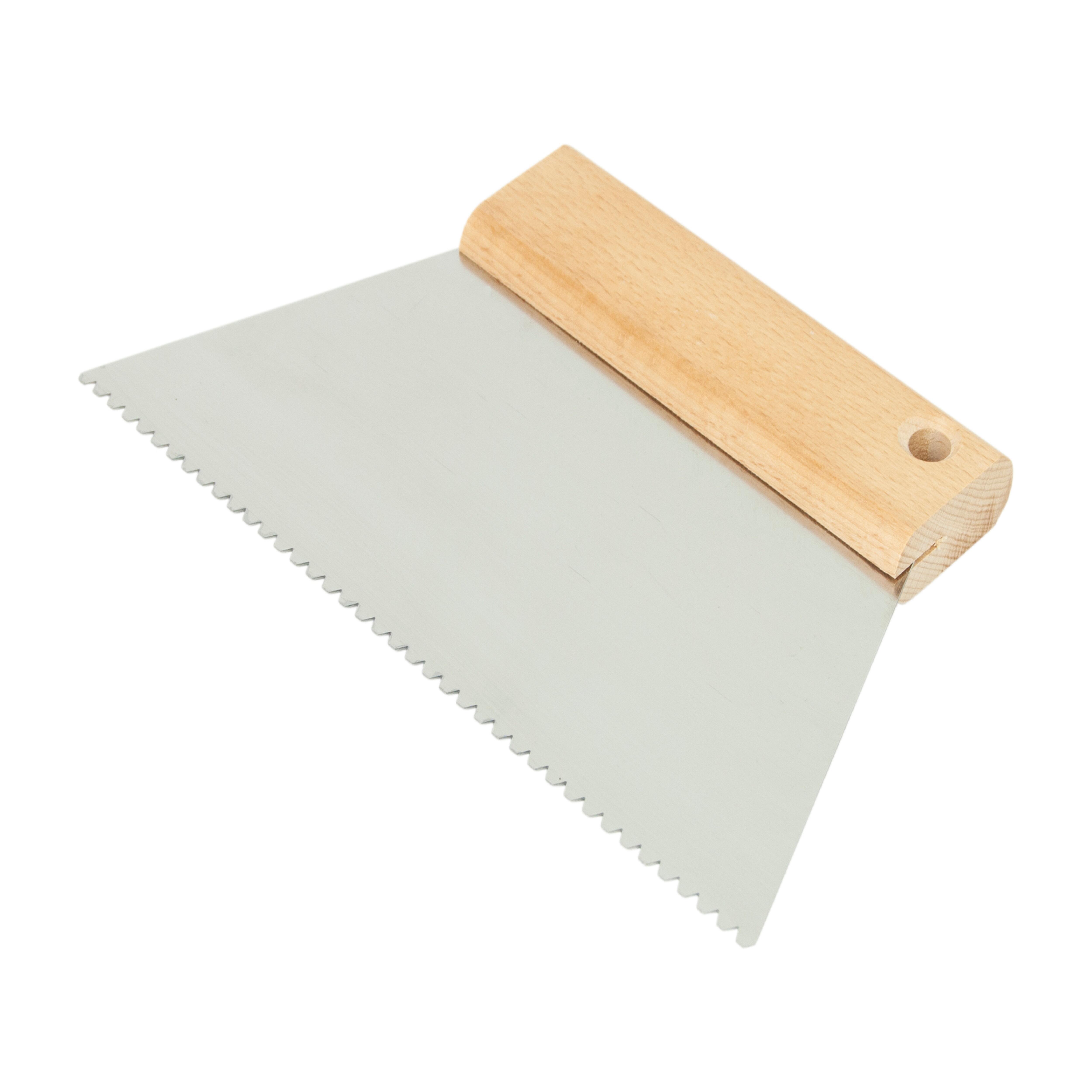 Espátula encolar de doble pico, dentada. Hoja de acero inoxidable, altura de los dientes 2,55mm. Mango madera de haya. Ancho 200mm.