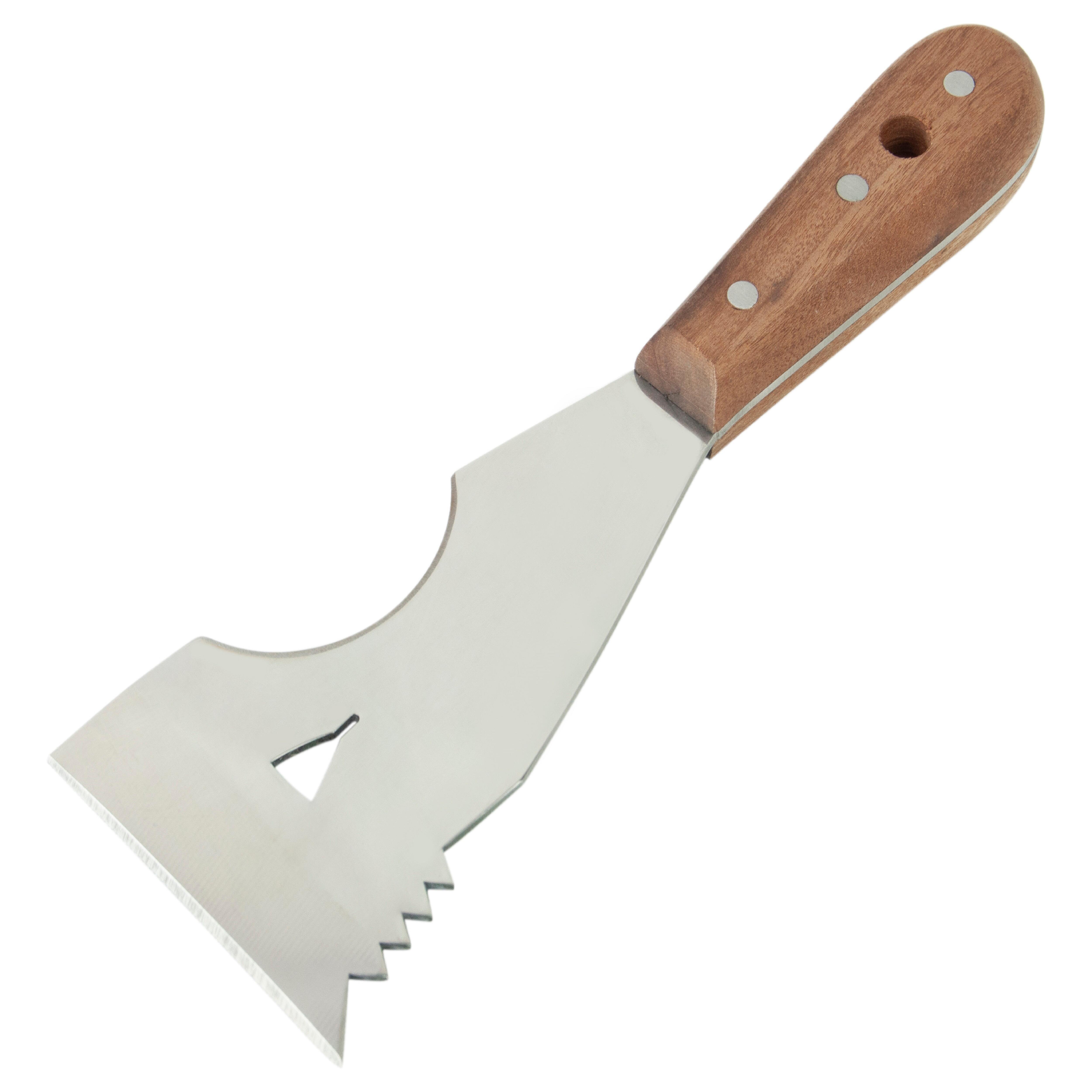 Espátula apta para realizar múltiples funciones como abre botellas, quita clavos, rascador tradicional etc. Hoja multiforma de acero inoxidable 1,8mm de espesor, rígida y con la boca biselada, acabado pulido espejo. Triple remache en hoja hasta el final del mango para asegurar su anclaje. Mango madera.