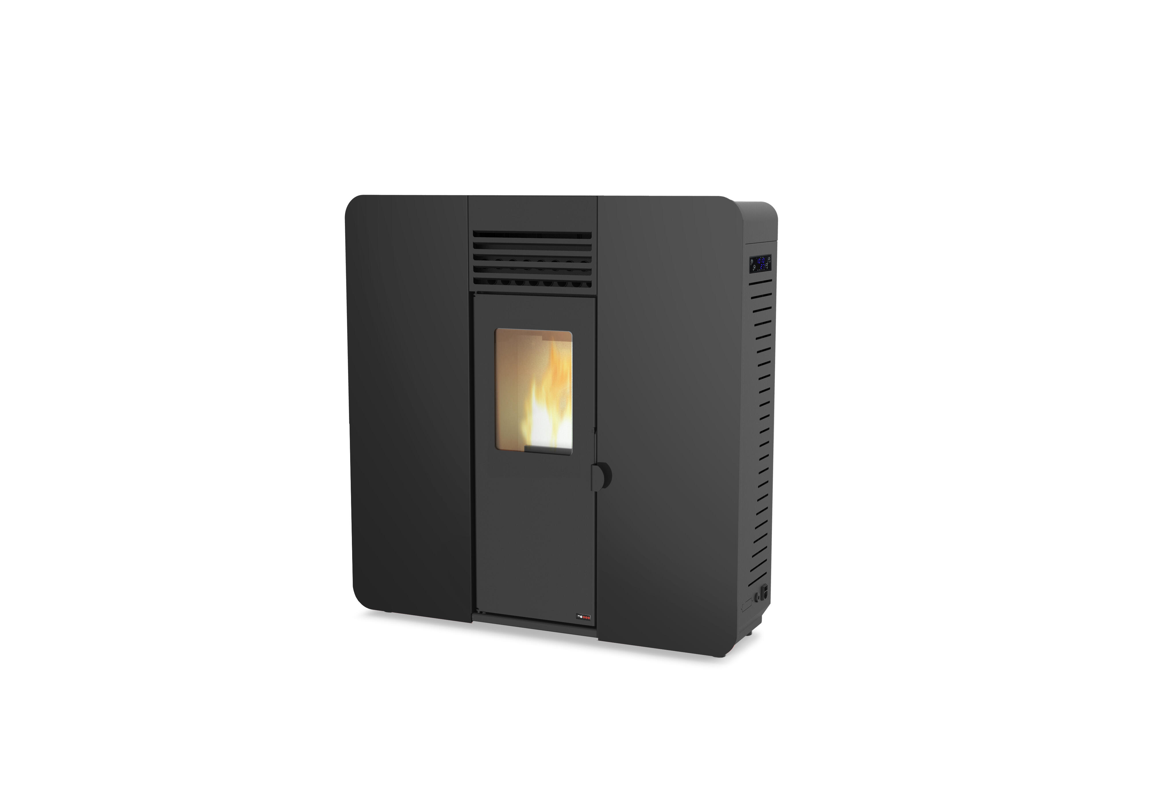 Estufa de pellet pasillo SZ 8kW negro. De 8 kW de potencia y superficie calefactable de 70 m2. Su consumo es de 0,68-1,6 kg/h y rendimiento del 95,8%. Este modelo de diseño ultra-estrecho es ideal para pasillos o estancias reducidas sin perder eficiencia. Cuenta con sistemas de control electrónico avanzados que optimizan la combustión.