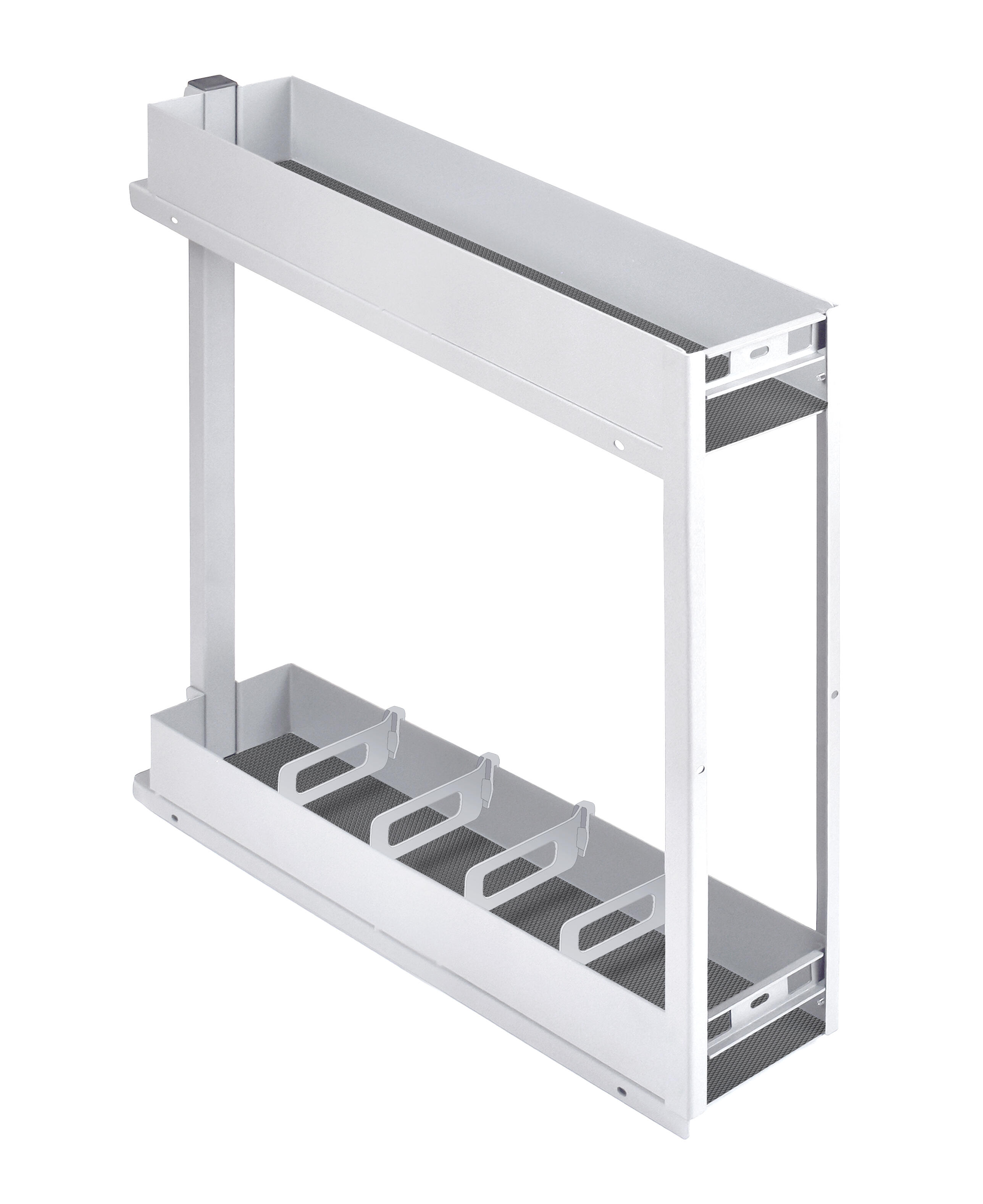 Fabricado en acero laminado en frio,acabado color blanco. Con guías de extracción total ambidiestras, sincronizadas . Destinado para un mueble bajo de 15 cm. Compuesto por dos niveles de almacenamiento con base de alambre y varillas de acero, uniones soldadas. El cierre es suave y extracción total. Se necesita una puerta de 70 x 15 cm de cualquier modelo de cocina. Incluye bolsa de poliéster multiusos.