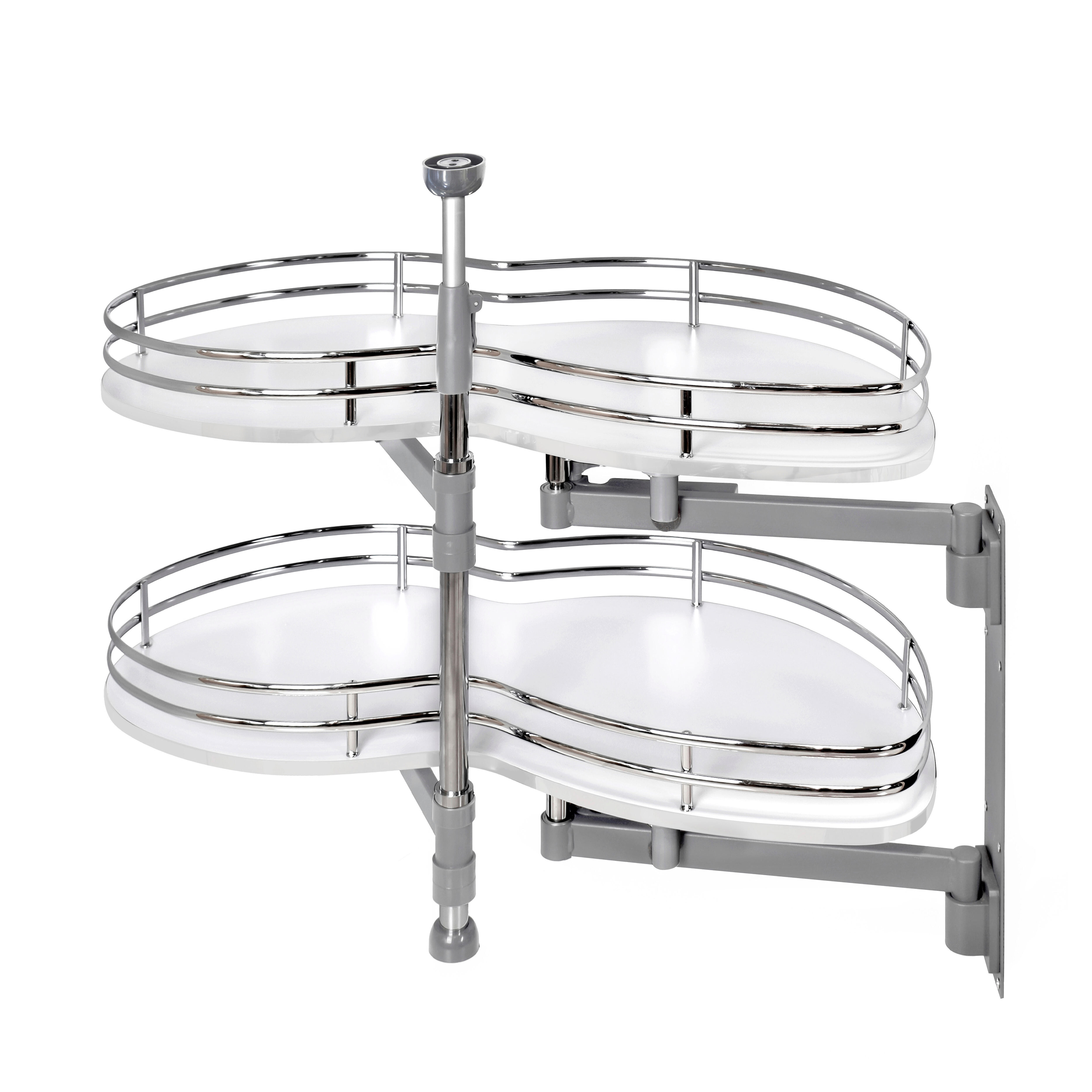 Fabricado en acero y bases en aglomerado de melamina blanca. Apertura derecha. Compuesto por dos bandejas en forma de riñón que permite el almacenamiento, con una extracción total fuera del mueble que incrementa la ergonomía y la facilidad de uso. Dispone de pistón hidráulico para que en el momento de recoger evite el golpe mediante un retroceso amortiguado. Compatible con casco de cocina bajo con un mínimo de 90 cm de ancho.