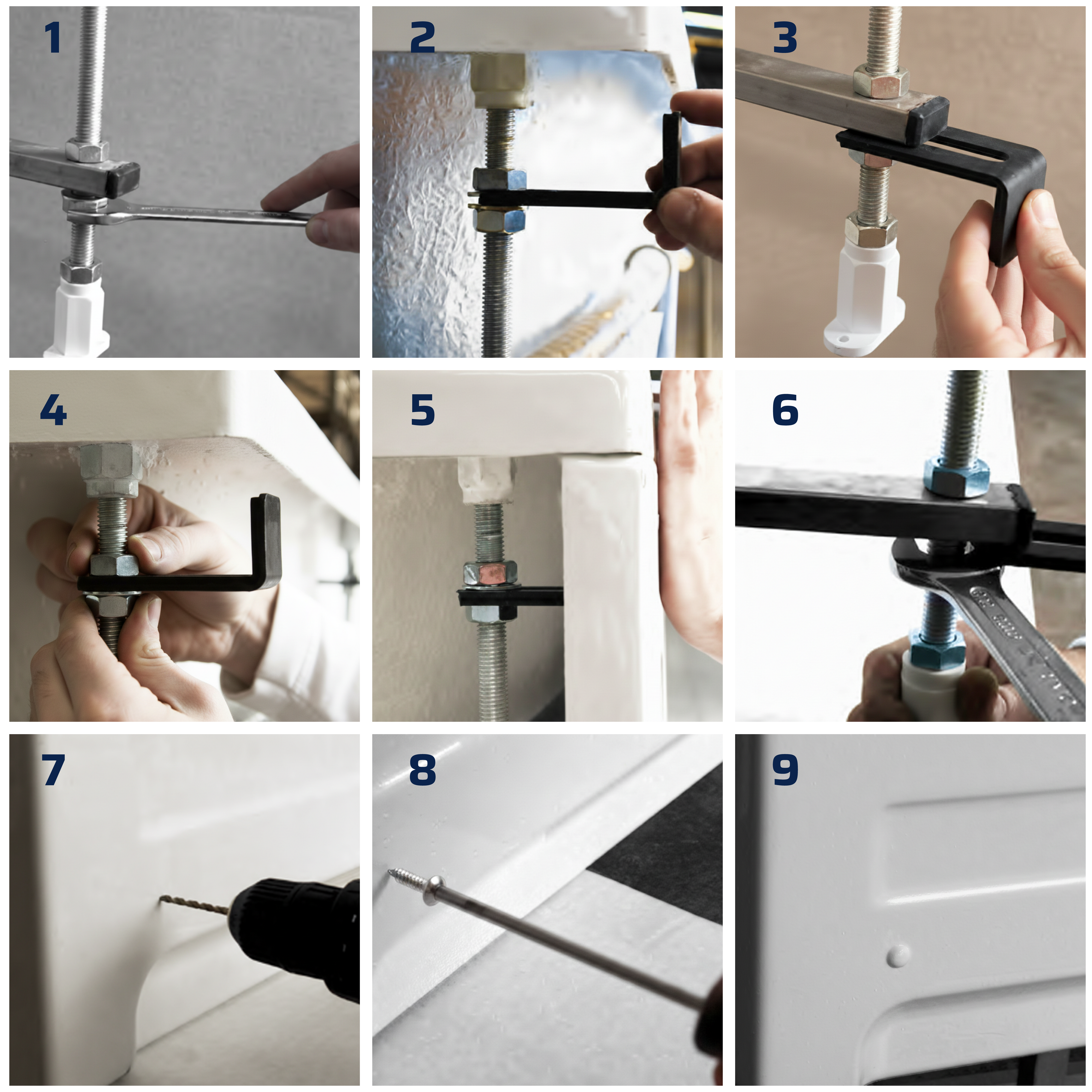 - Situar estos soportes entre la estructura y la arandela con el ala hacia abajo. (Nota: Dejar los soportes 0,5 cm hacia fuera de la pestaña para ajuste posterior).