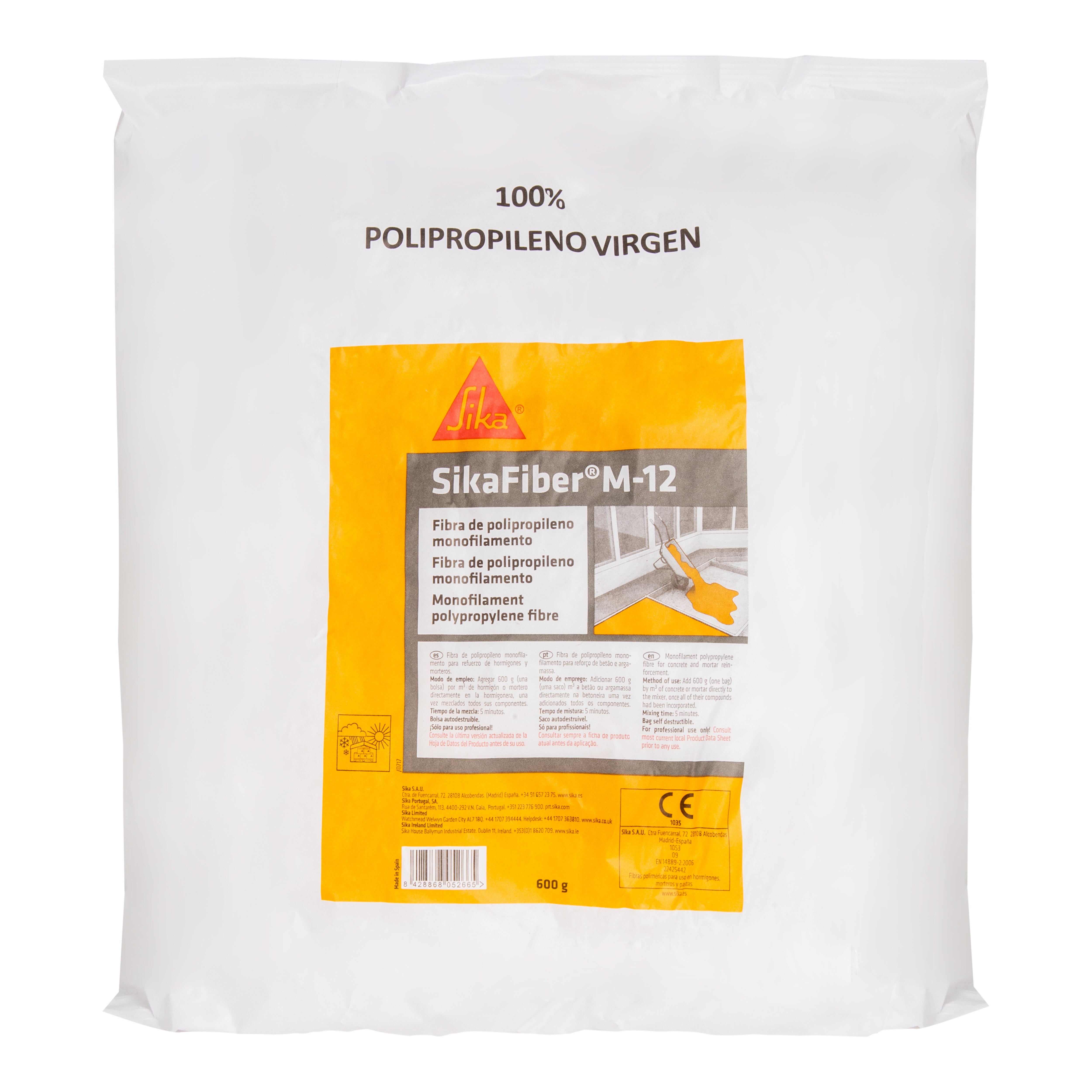 Fibra de polipropileno multifilamento SIKAFIBER M12 para el refuerzo de hormigones y morteros. Aumenta la durabilidad y evita la fisuración. Mejora la resistencia al impacto, la fisuración, a flexotracción y a la abrasión. Usos: Morteros de revoco de fachada, y elementos prefabricados. Losas y pavimentos de hormigón. Morteros y hormigones proyectados. Revestimiento de canales.