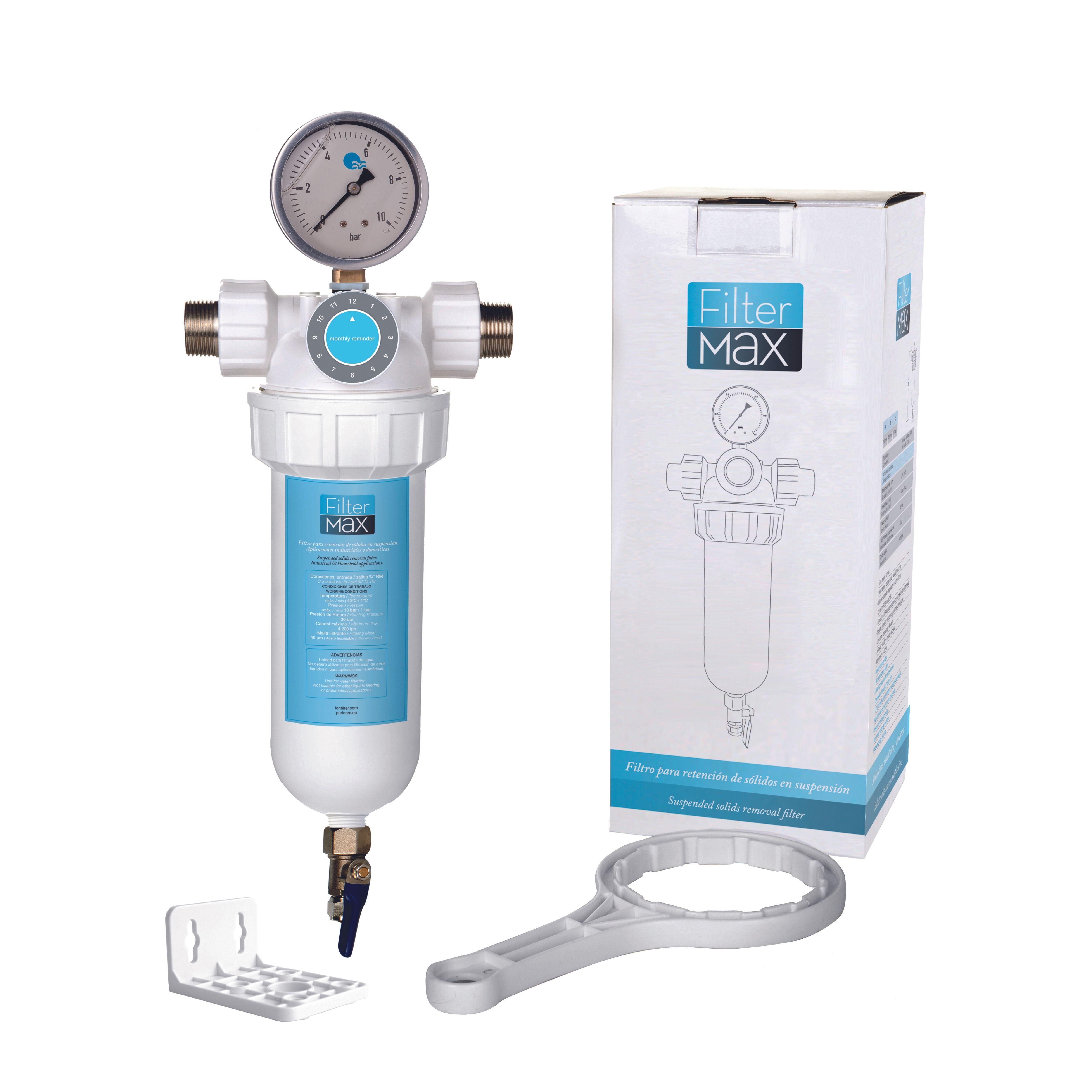 Para la eliminación de elementos en suspensión en el agua. Ideal para prevenir que cualquier piedrecita o elemento en suspensión en el agua dañe cualquier parte de grifos, caldera, descalcificador. Evitará muchas incrustaciones en sus instalaciones ya que los elementos en suspensión en el agua son los que ayudan a la formación de las mismas junto a otros elemento . Incluye: Lavado de forma semiautomática abriendo válvula inferior de conexión a tubo de 3/8". Conexión de 3/4" macho de acero. Conexión 1/4" para manómetro incluido. Soporte plásticos y accesorios de montaje incluidos para montaje.