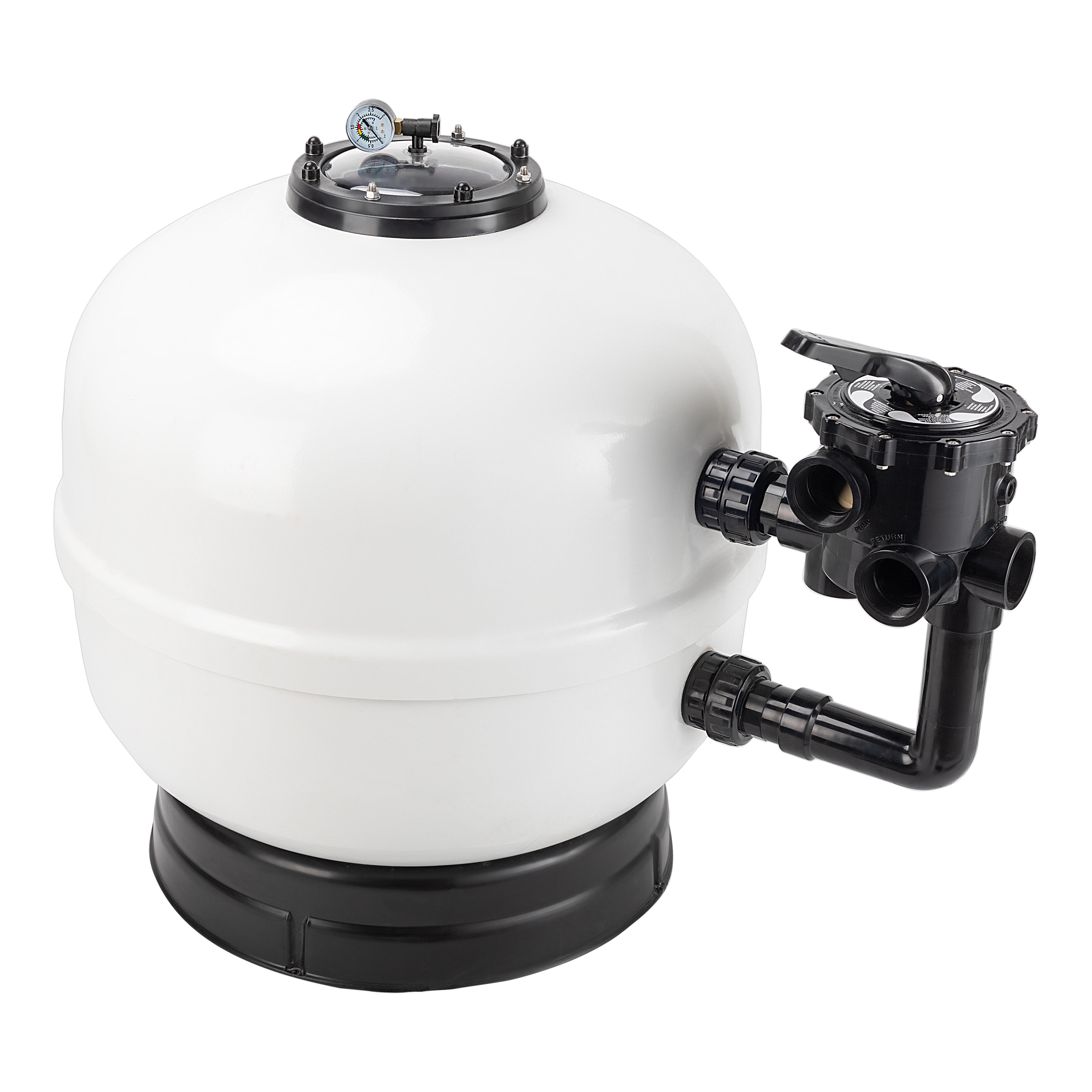 En resina poliéster y fibra de vidrio, montado con colectores de 1″ de diámetro y difusor de plástico inalterable PVC y PP. Equipado con manómetro, purga de aire manual y purga de agua manual. Válvula selectora lateral de seis vías para operaciones de filtración, lavado, enjuague, recirculación, vaciado y cerrado. Pie de polipropileno, excepto con diámetro 900 mm, que es de resina de poliéster y fibra de vidrio. Tapa sin tornillos de apertura y cierre rápido.