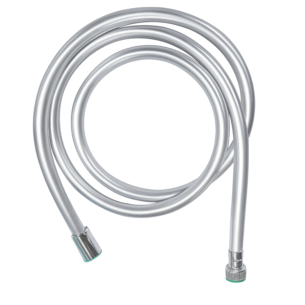 Flexo de ducha metálico con doble grapado, fabricado en latón, con revestimiento de PVC en color plata, con sistema anti-torceduras. Longitud de 175 cm.