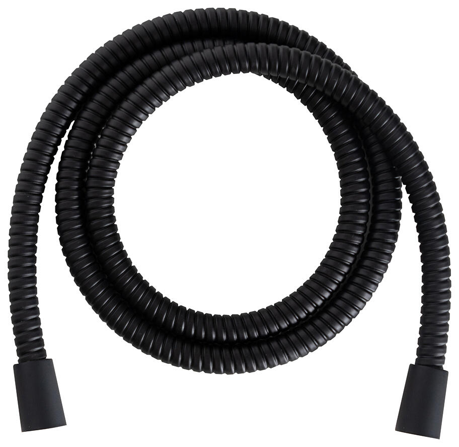 Flexo de ducha metálico con doble grapado, fabricado en metal, con revestimiento de PVC en color negro, extensible. Con resistencia a la tracción de hasta 40kg