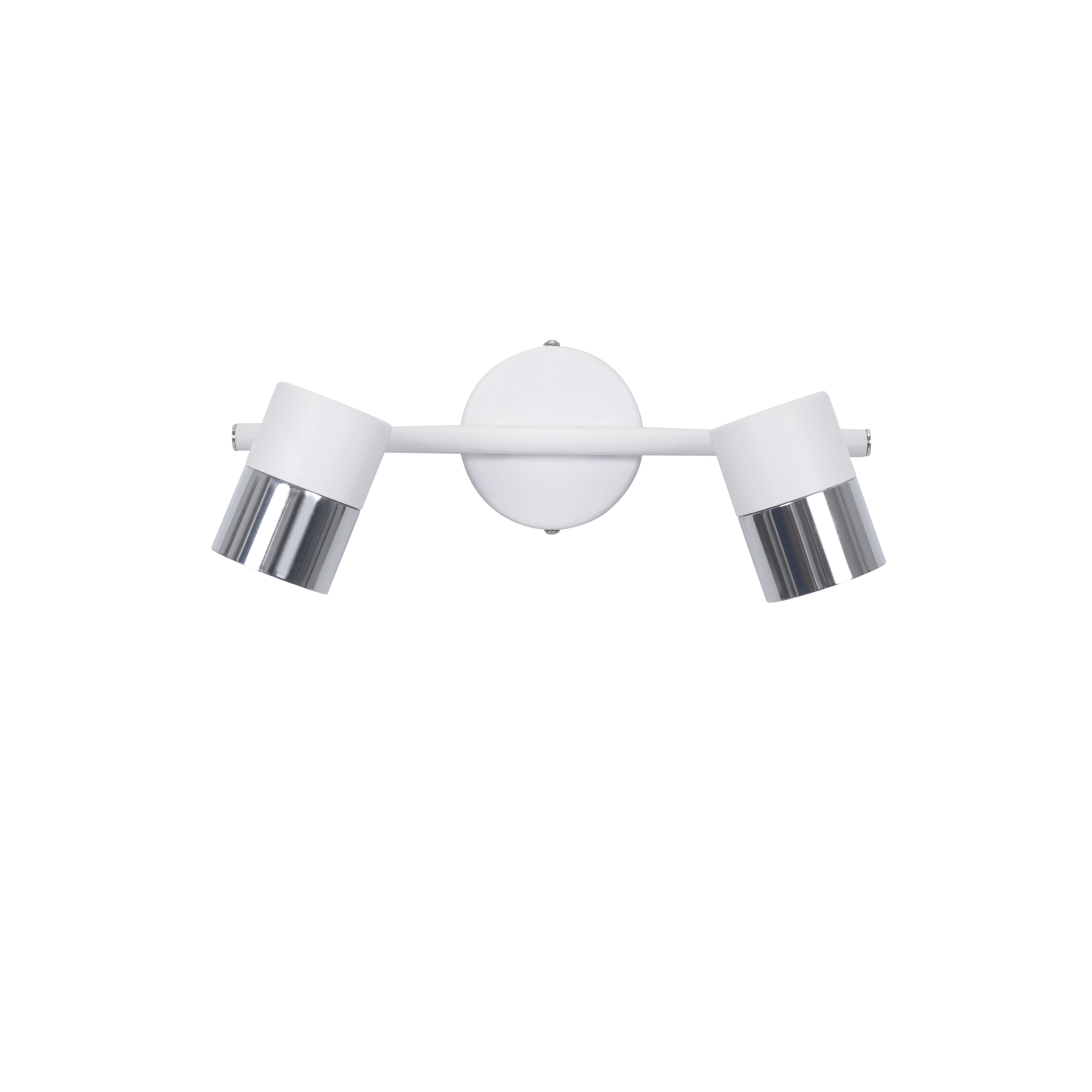 Foco 2 luces Cloc IP20. Posibilidad de instalar tanto en el techo como en pared. Medidas Ø9x8 cm. Acabado en blanco fabricado en aluminio. Cabezal de foco ajustable.
