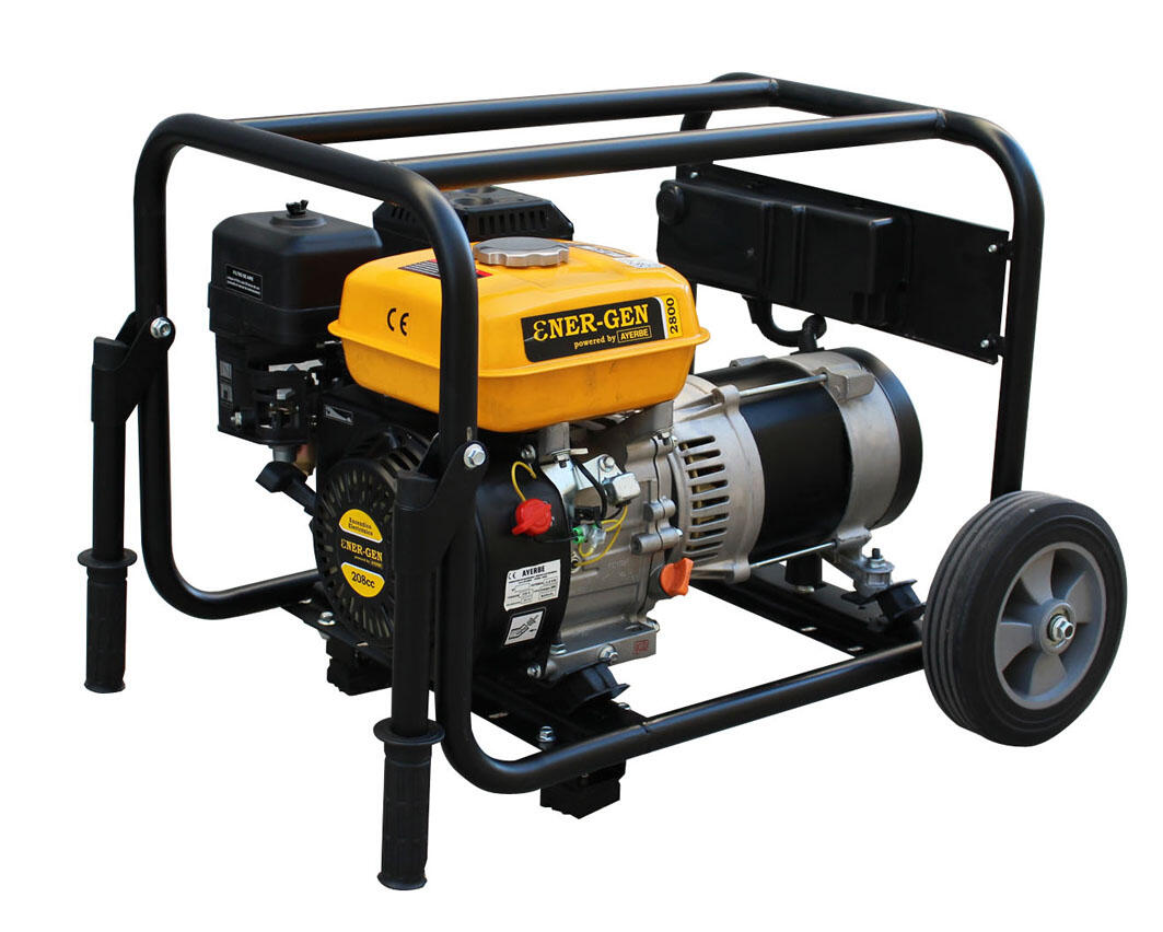 Generador gasolina 4 tiempos. 208cc. Potencia máxima 2.800W (2.500W nominal. Tensión 230 V-50 Hz. Sistema de arranque manual. Regulación de voltaje AVR. Alternador bobinado íntegramente en cobre. Parada automática por falta de aceite. Nivel sonoro 96 Db. Depósito de combustible 3.6 l. Kit de transporte integrado con ruedas. Peso 36 kg.