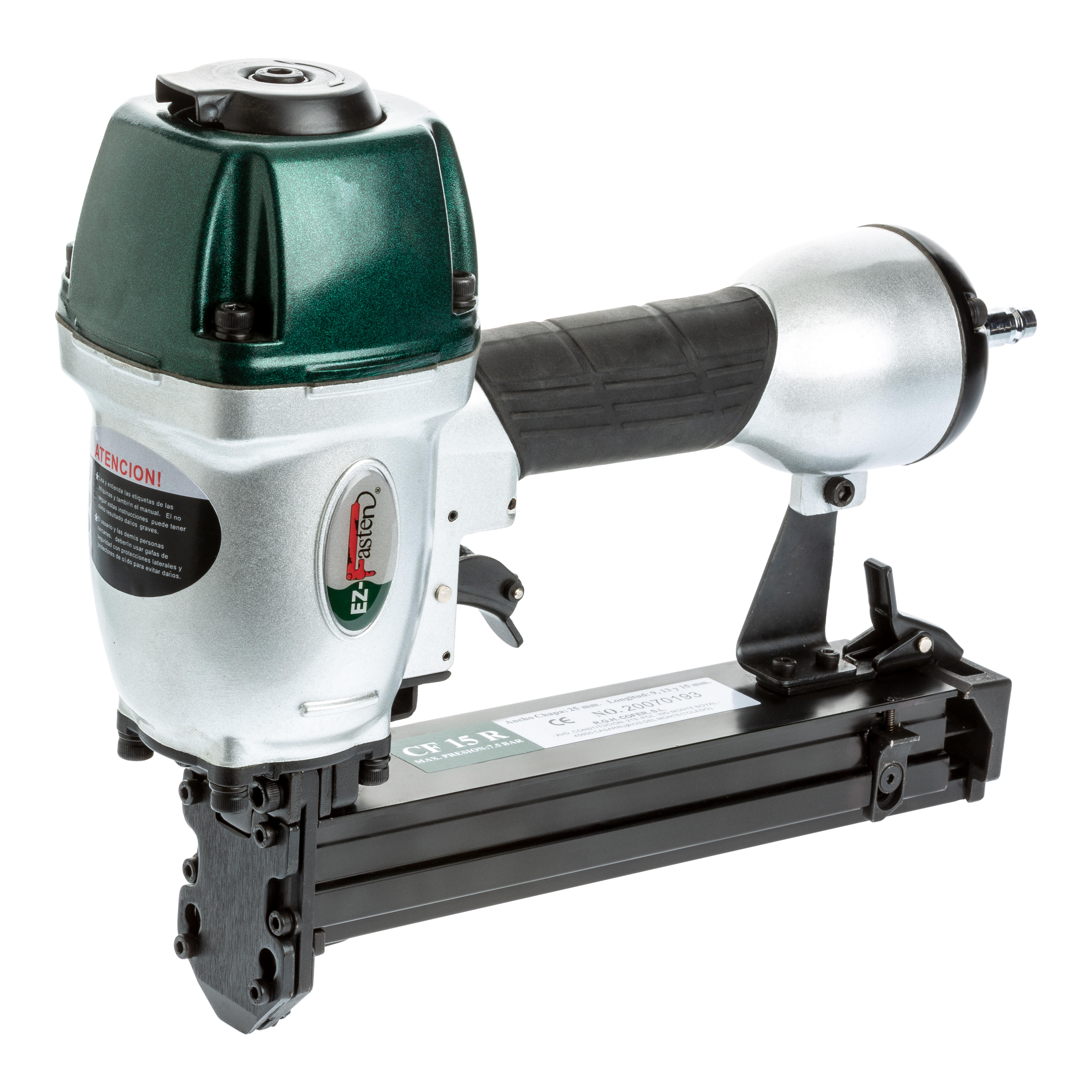 Grapadora neumática para chapas coarrugadas de 25 mm x 13 mm. Especial montaje puertas block. Uniones en general. Cuerpo y carro en aluminio. Regulador de profundidad. Expulsión de aire trasera, (menor vibración y retroceso) 2 en 1. Dispara dos tipos de clavos 1,4 de Hierro para madera y Ø 1,83 Acero para hormigón y chapa de acero. Especial Zócalos y Rodapié.