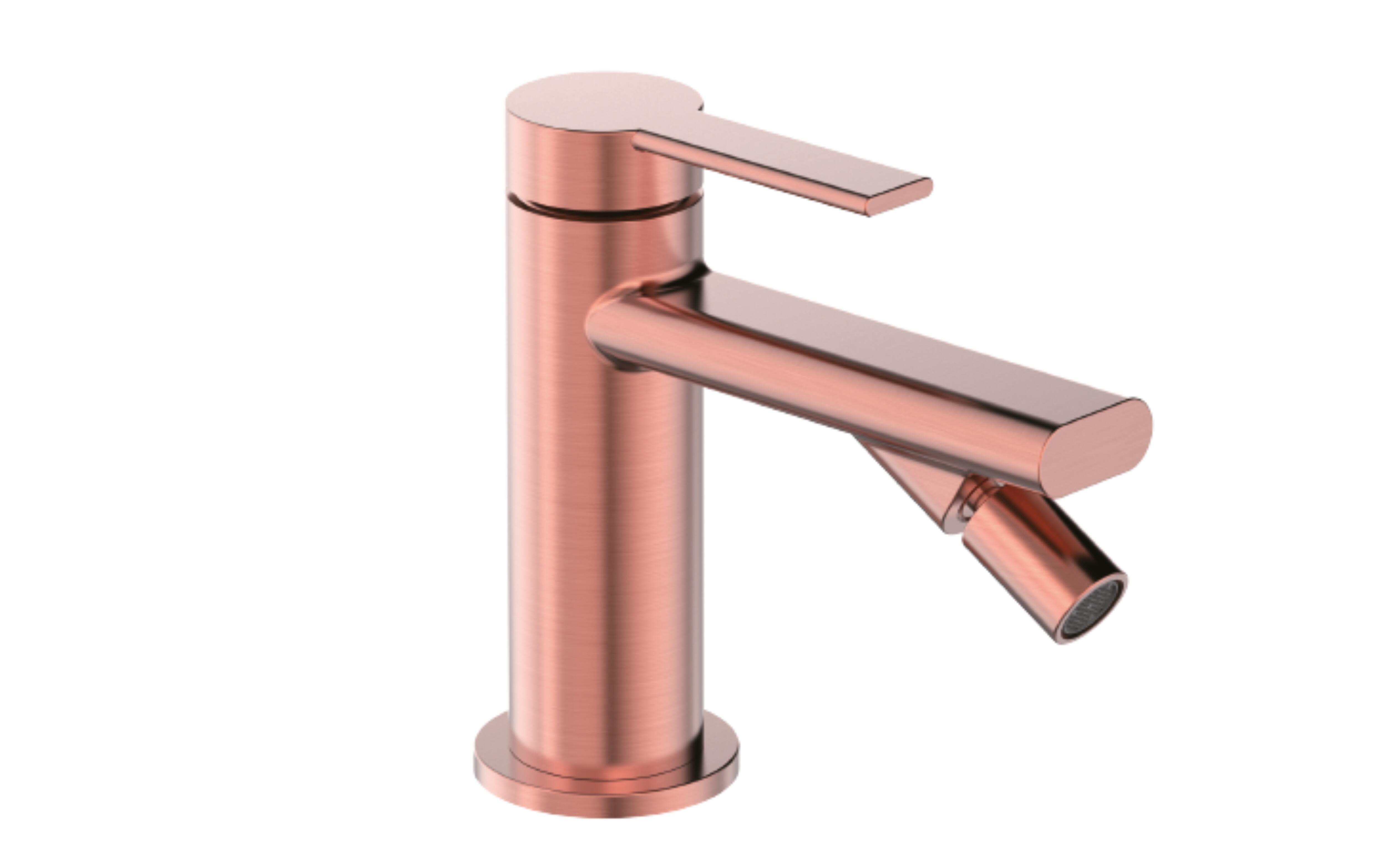 Grifo bidet monomando de la serie Rondo, acabado PVD cobre, caño alto, medidas 260x185x75mm.