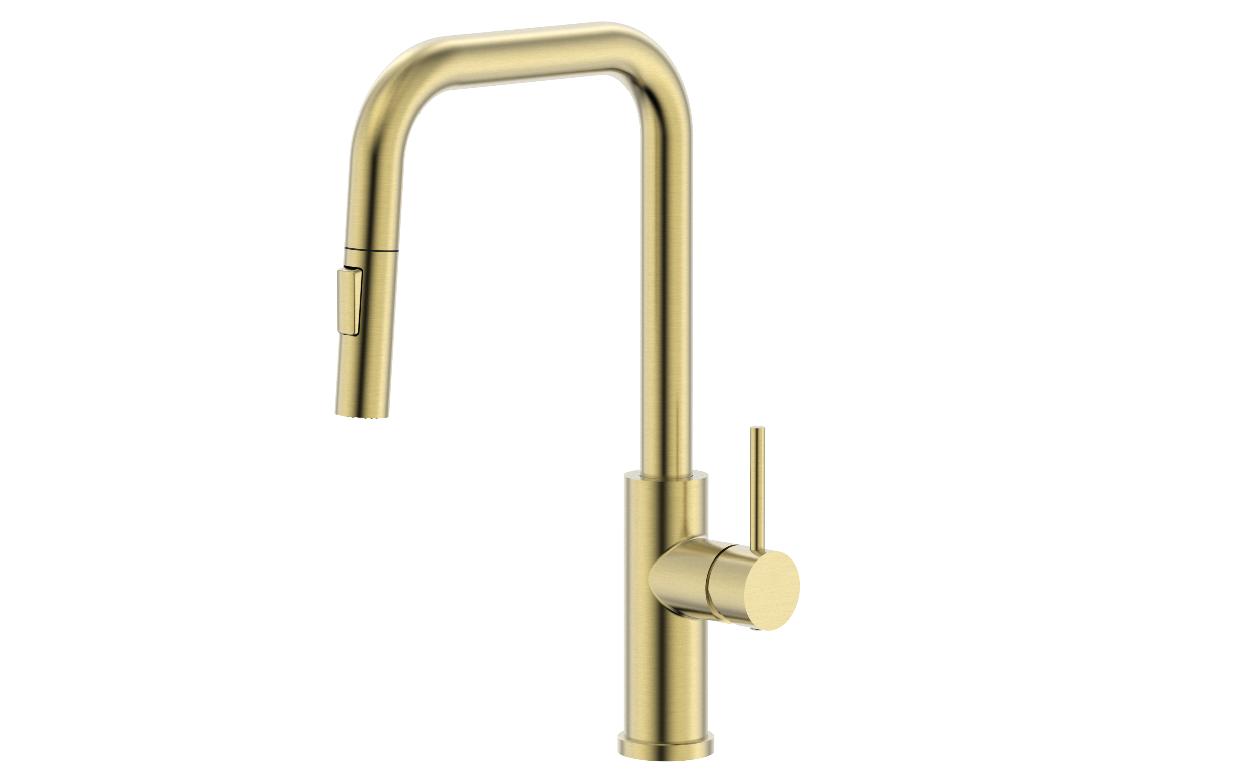 Grifo de cocina monomando, de la marca Corberó. modelo PVD oro cepillado. Fabricado en acero inoxidable. Acabado PVD. De caño alto.