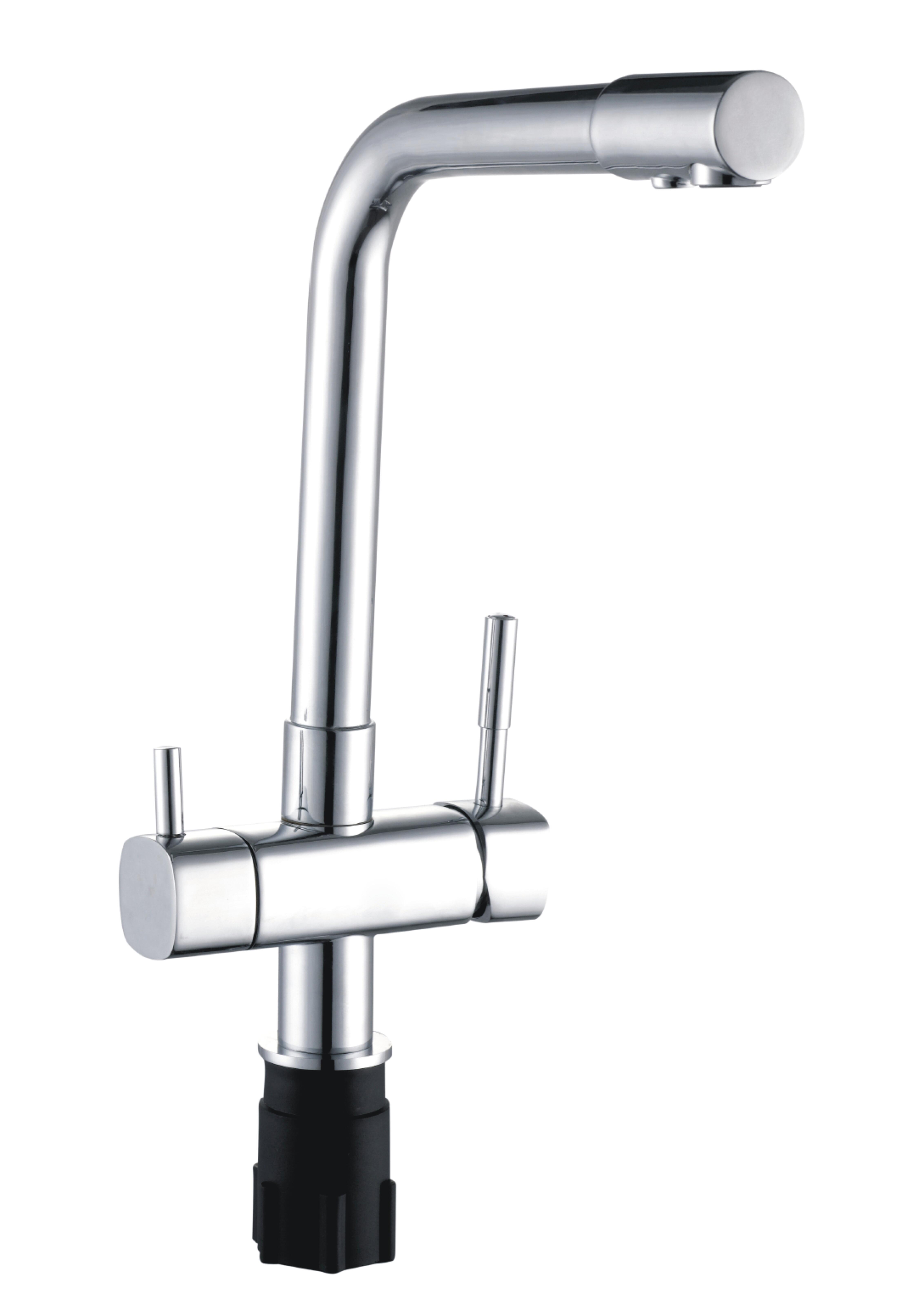 Monomando grifo de cocina, fabricado en latón cromado. Con doble salida, por osmosis en frío, y en caliente mediante maneta lateral de accionamiento manual. De caño alto y móvil, con doble salida de agua. Incluye aireador con reductor de caudal que permite un ahorro de agua.