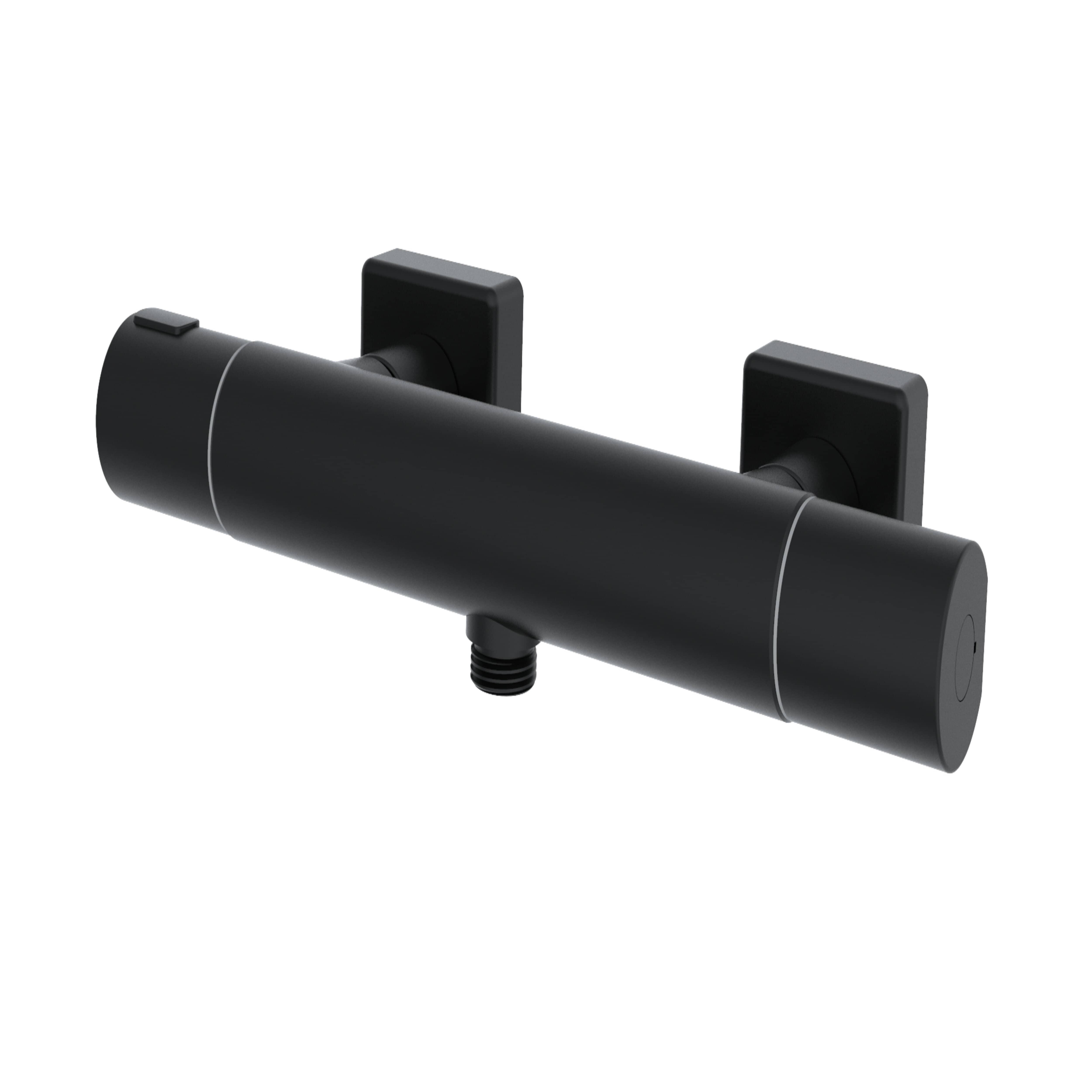 Mezclador de ducha termostático fabricado en latón, color negro, con sistema de seguridad de 38º.