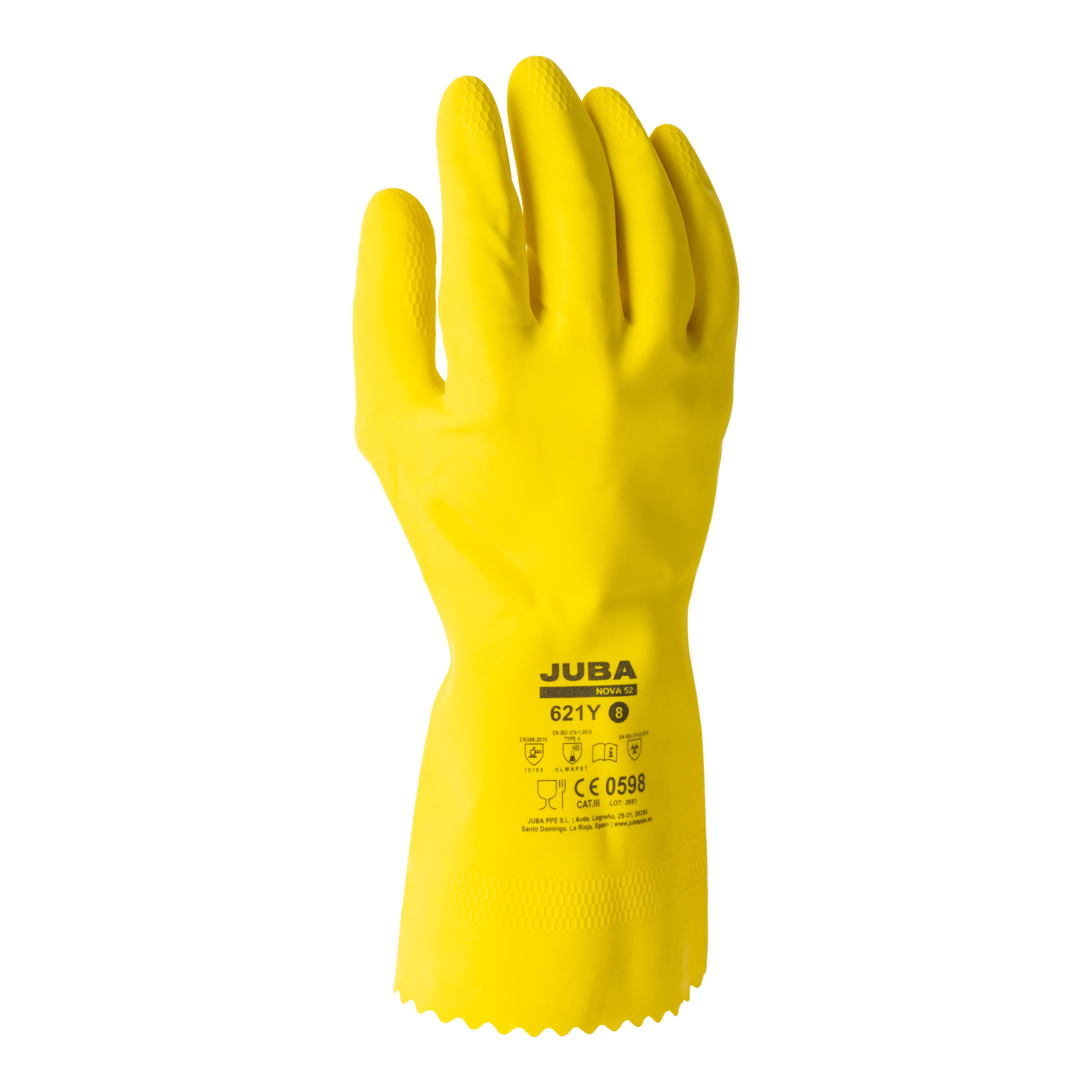 Guante sin soporte de látex natural con flocado interior de algodón para absorber el sudor. Color amarillo. Patrón antideslizante con acabado panel de abeja para un óptimo agarre en ambientes húmedos y secos. Apto para uso alimentario. Para bacterias y hongos este guante tiene estanqueidad total según EN 374-2:2014.