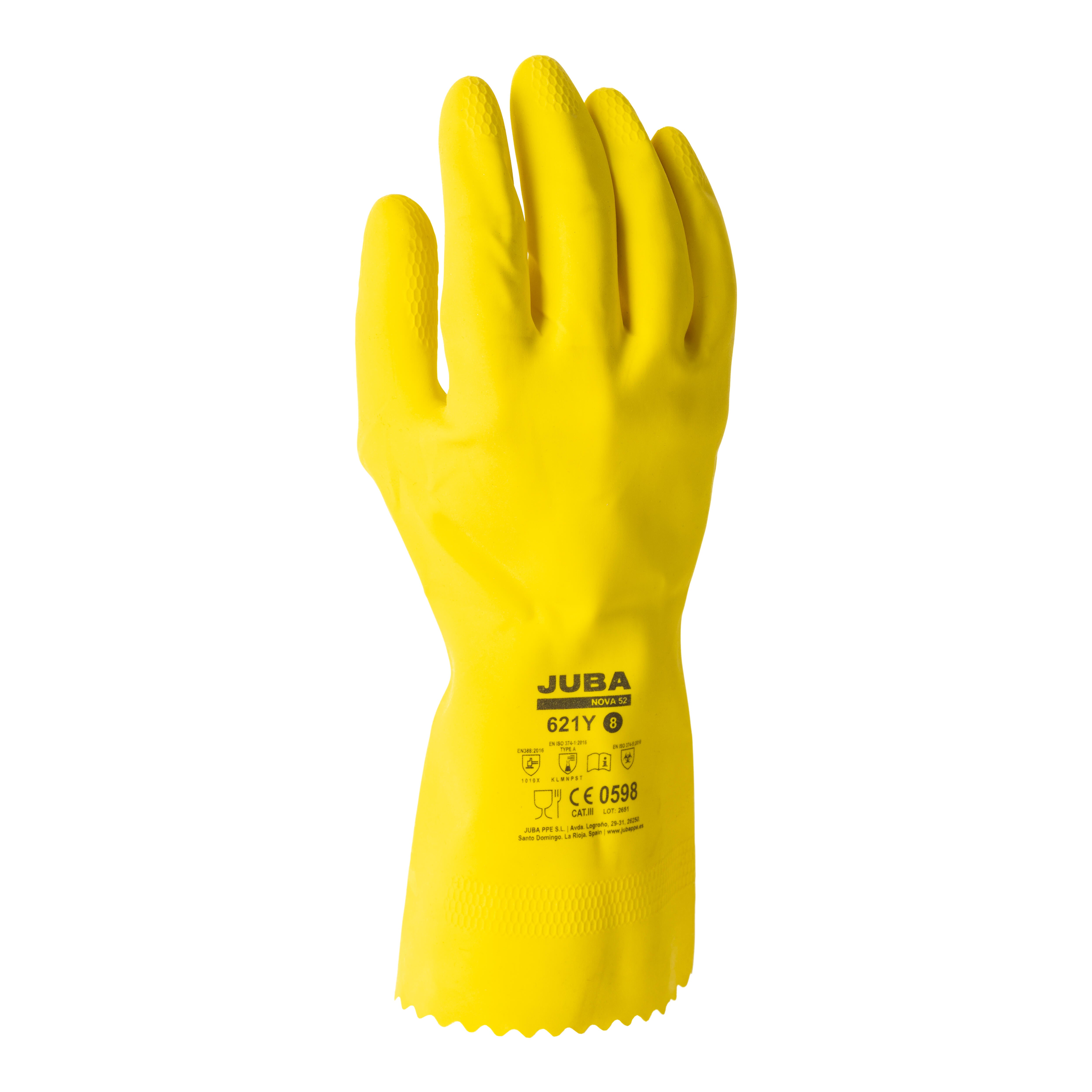 Guante sin soporte de látex natural con flocado interior de algodón para absorber el sudor. Color amarillo. Patrón antideslizante con acabado panel de abeja para un óptimo agarre en ambientes húmedos y secos. Apto para uso alimentario. Para bacterias y hongos este guante tiene estanqueidad total según EN 374-2:2014.