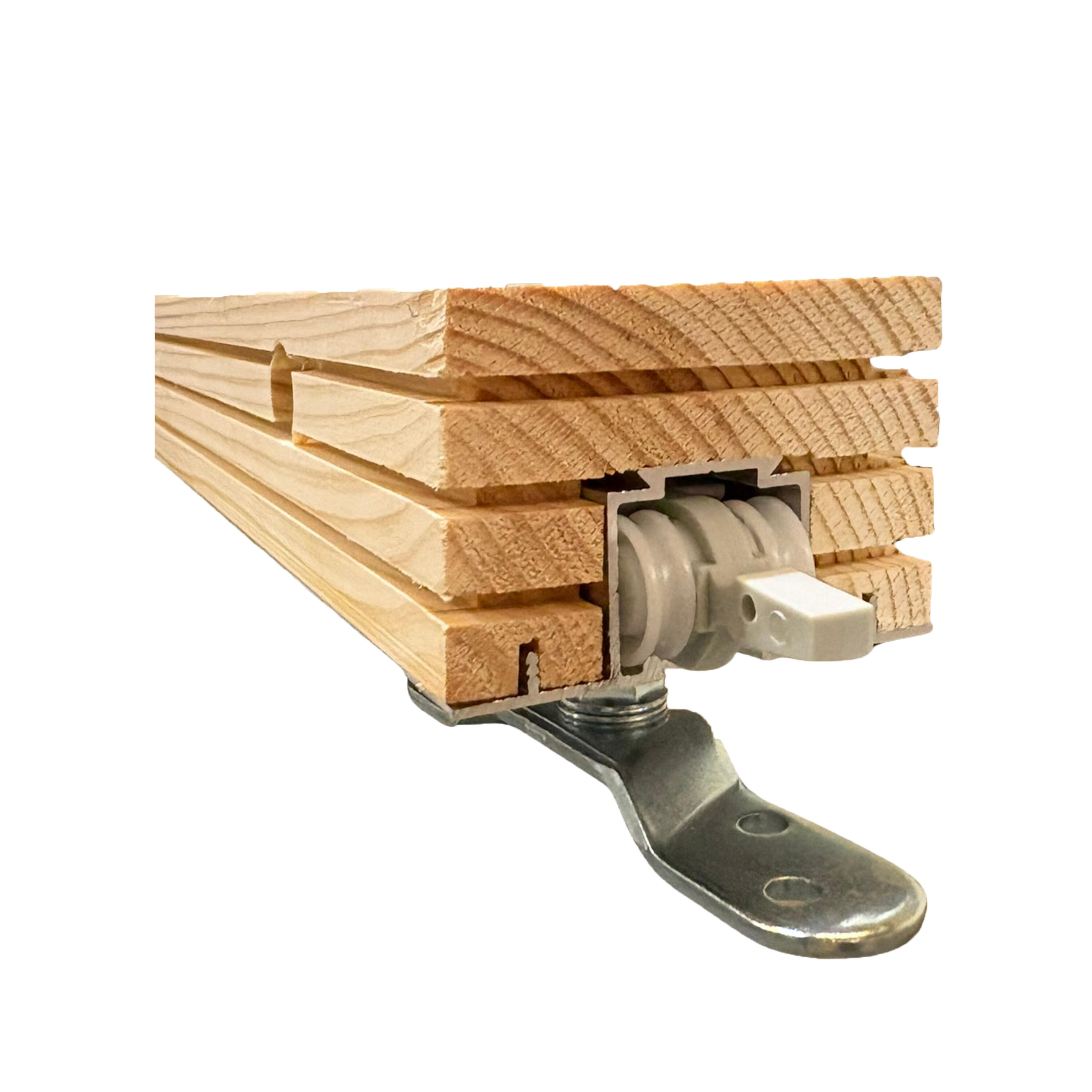 Sistema de guía de puerta corredera sobre tabique que consiste en una guía de aluminio con alas embutida en listón de madera de pino, que facilita la instalación a pared.