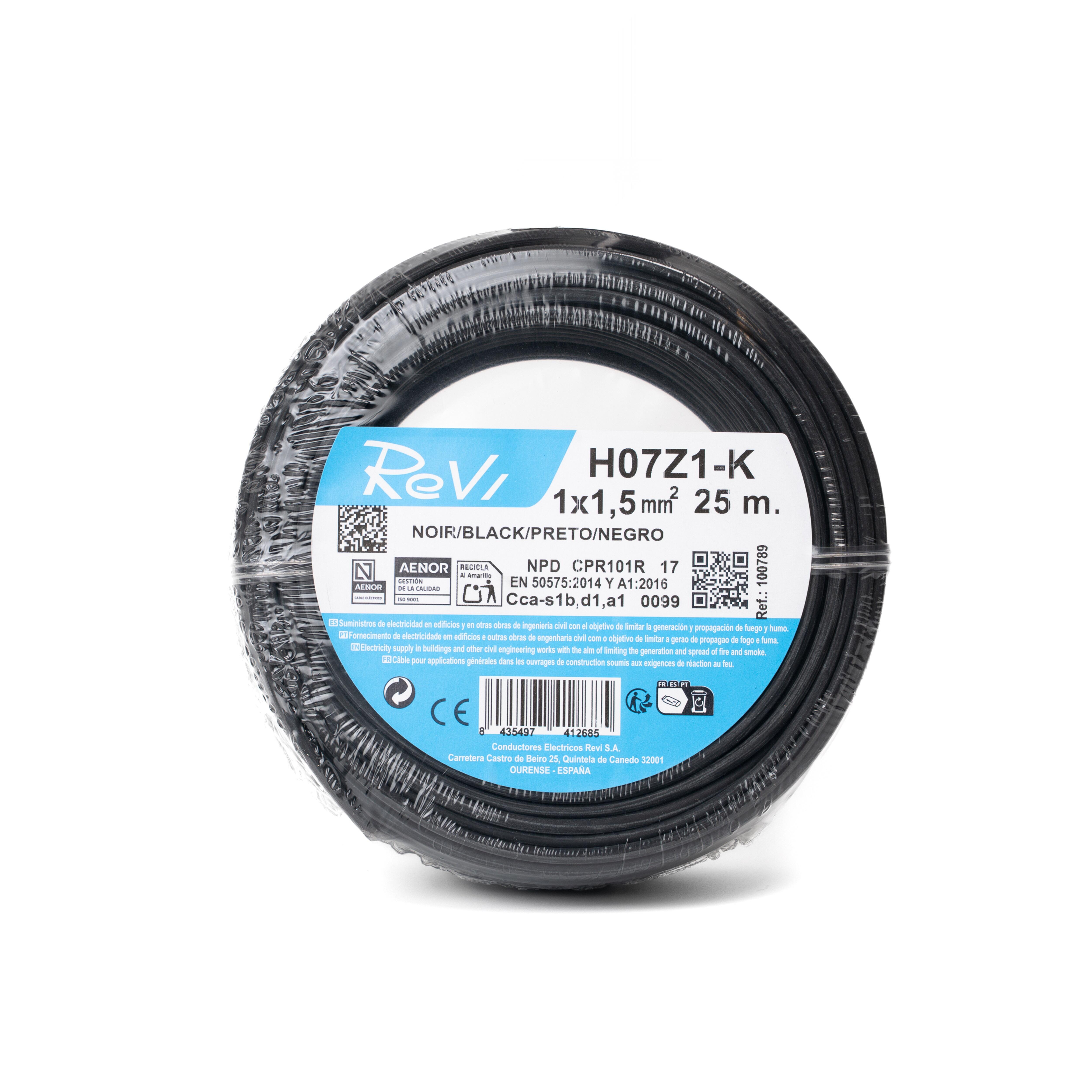 - Rollo de 25m hilo flexible LH H07Z1-K 1.5mm² con aislamiento tipo T17 según UNE-EN 50363-7 de color negro.