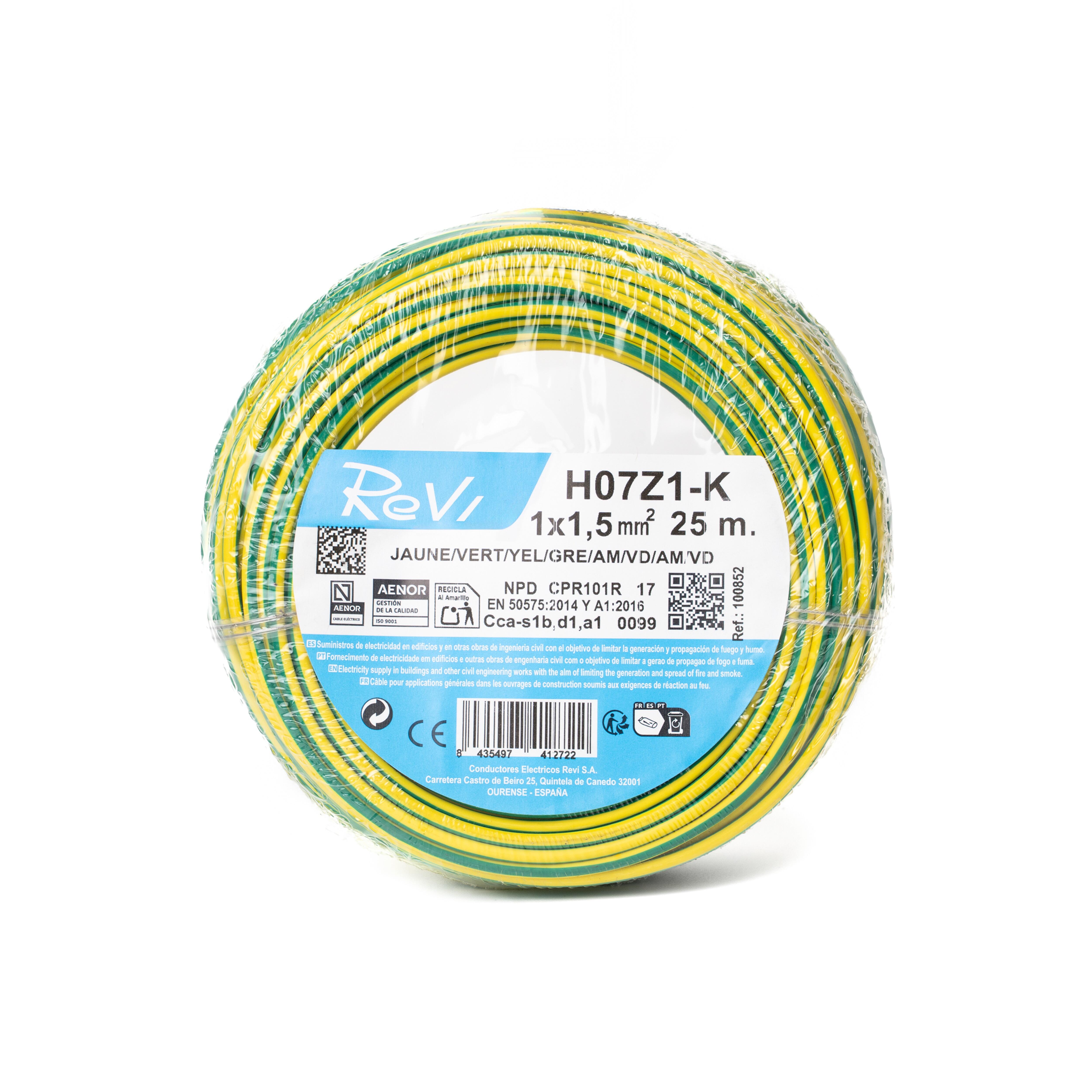 - Rollo de 25m hilo flexible LH H07Z1-K 1.5mm² con aislamiento tipo T17 según UNE-EN 50363-7 de color verde / amarillo.