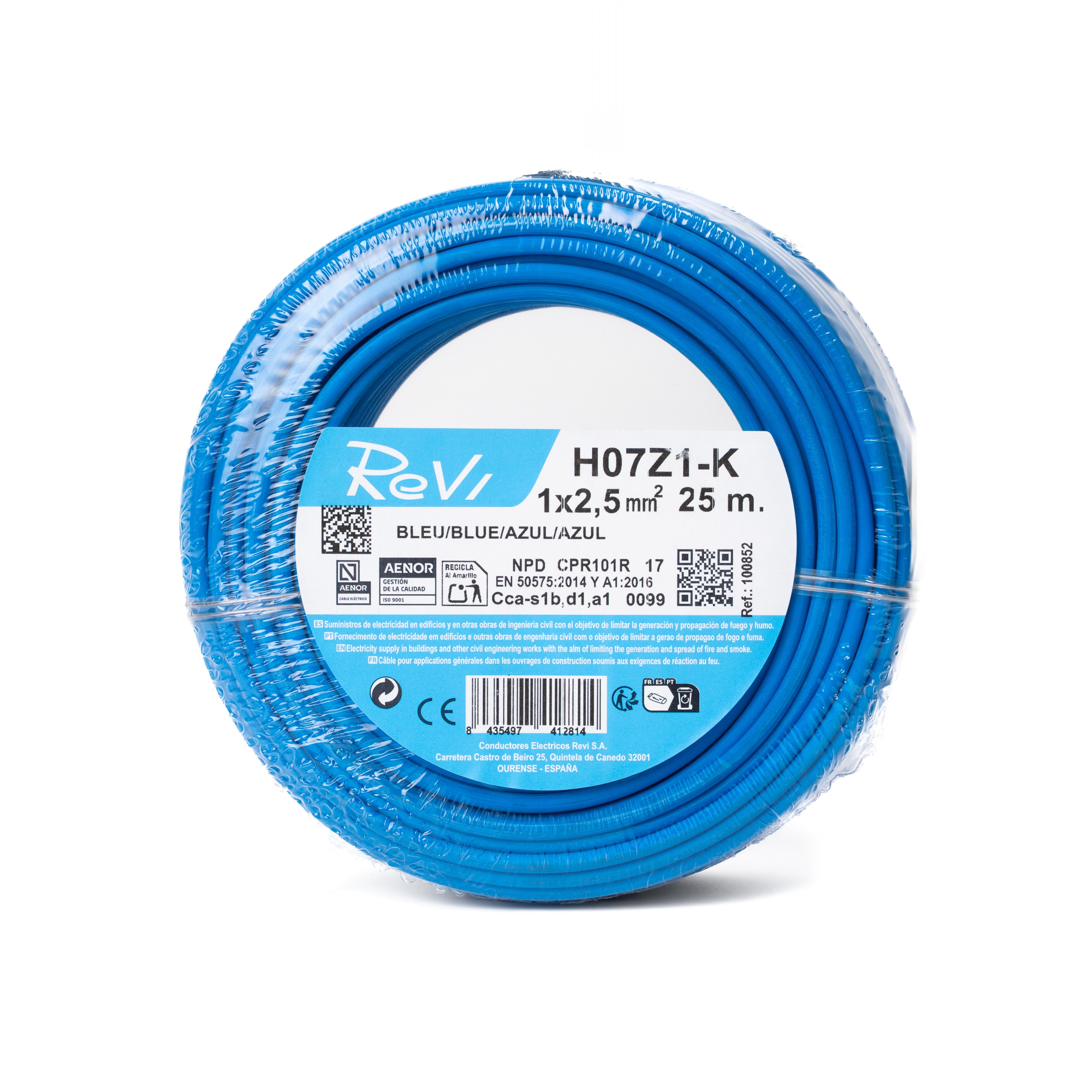 - Rollo de 25m hilo flexible LH H07Z1-K 2.5mm² con aislamiento tipo T17 según UNE-EN 50363-7 de color azul.