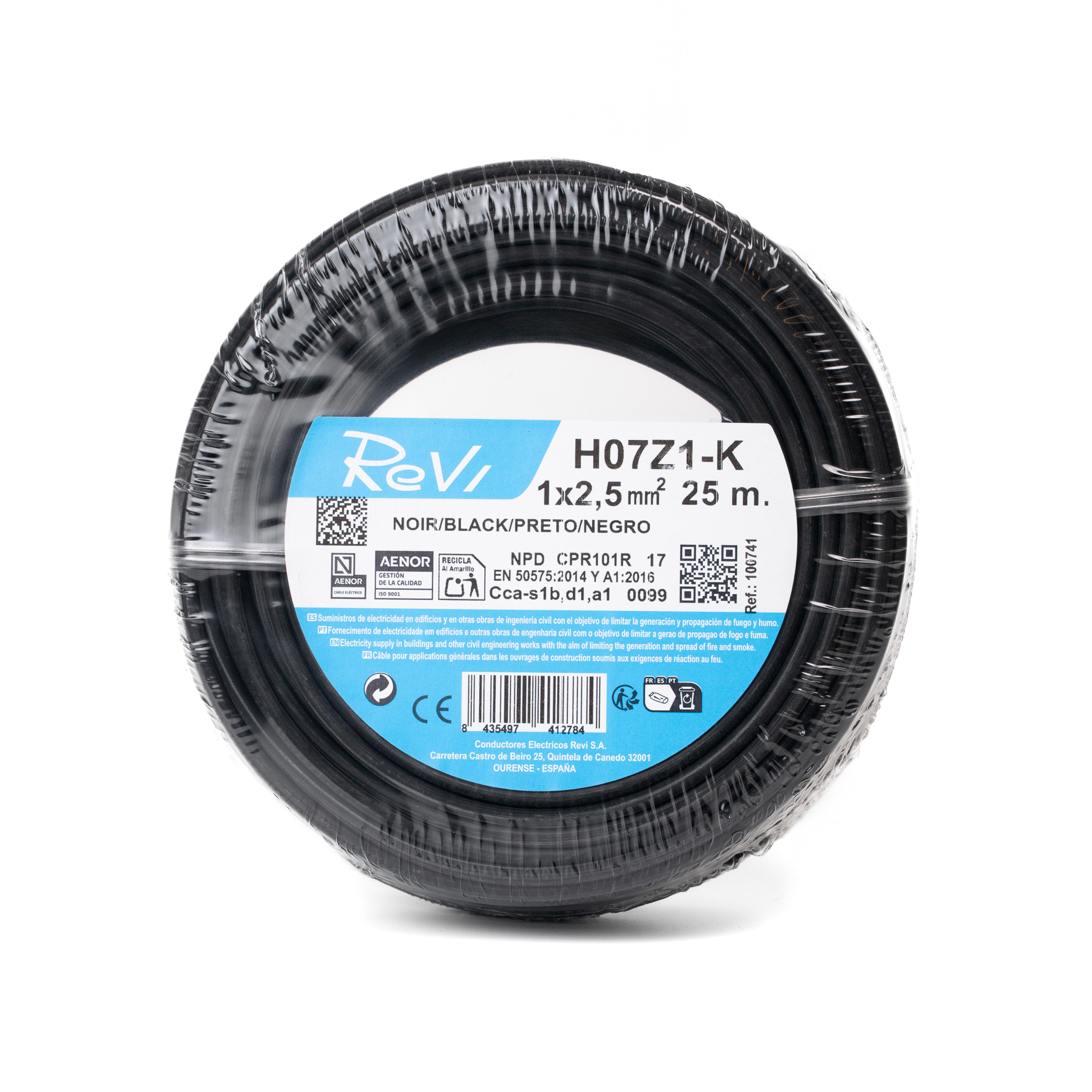 - Rollo de 25m hilo flexible LH H07Z1-K 2.5mm² con aislamiento tipo T17 según UNE-EN 50363-7 de color negro.