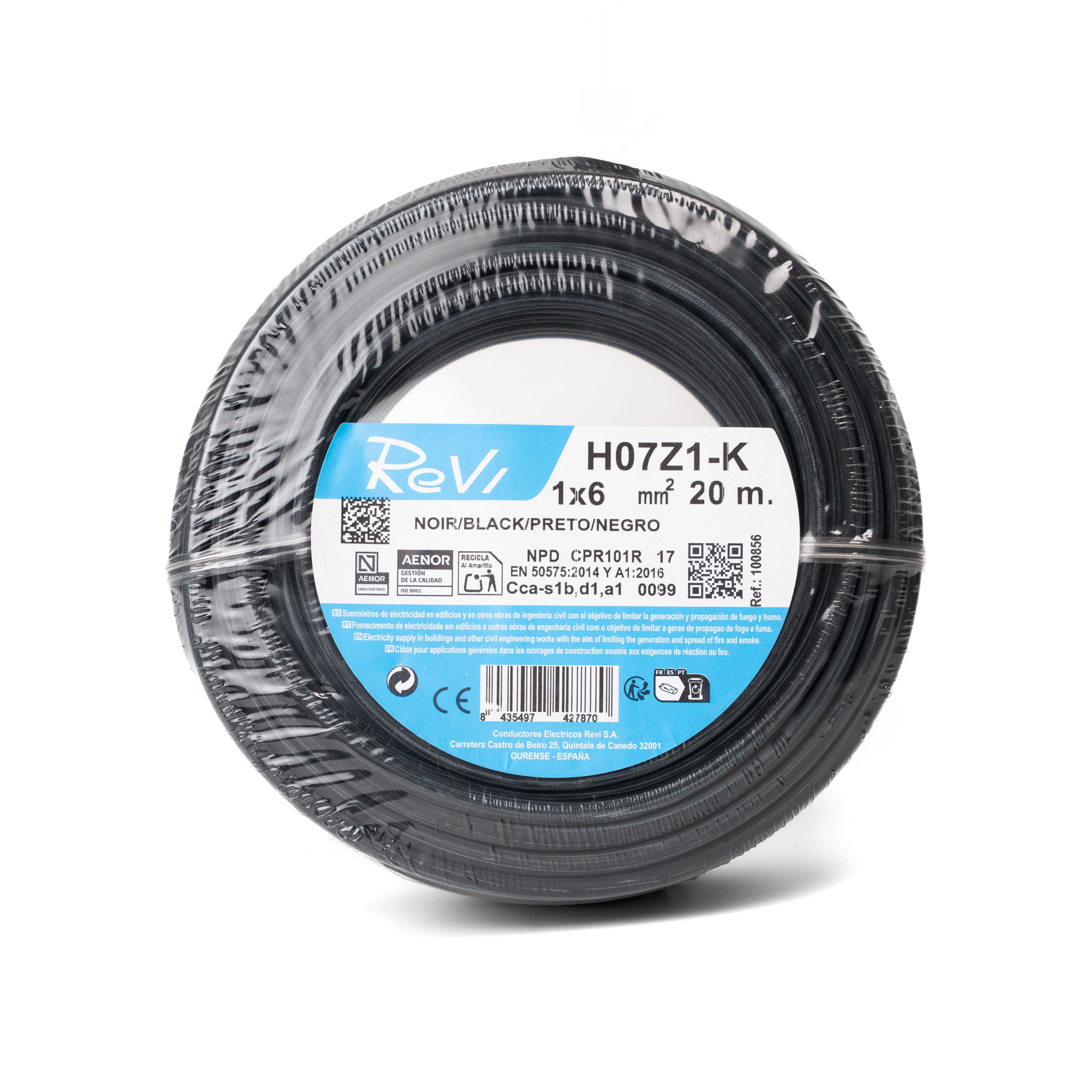 - Rollo de 20m hilo flexible LH H07Z1-K 6mm² con aislamiento tipo T17 según UNE-EN 50363-7 de color negro.