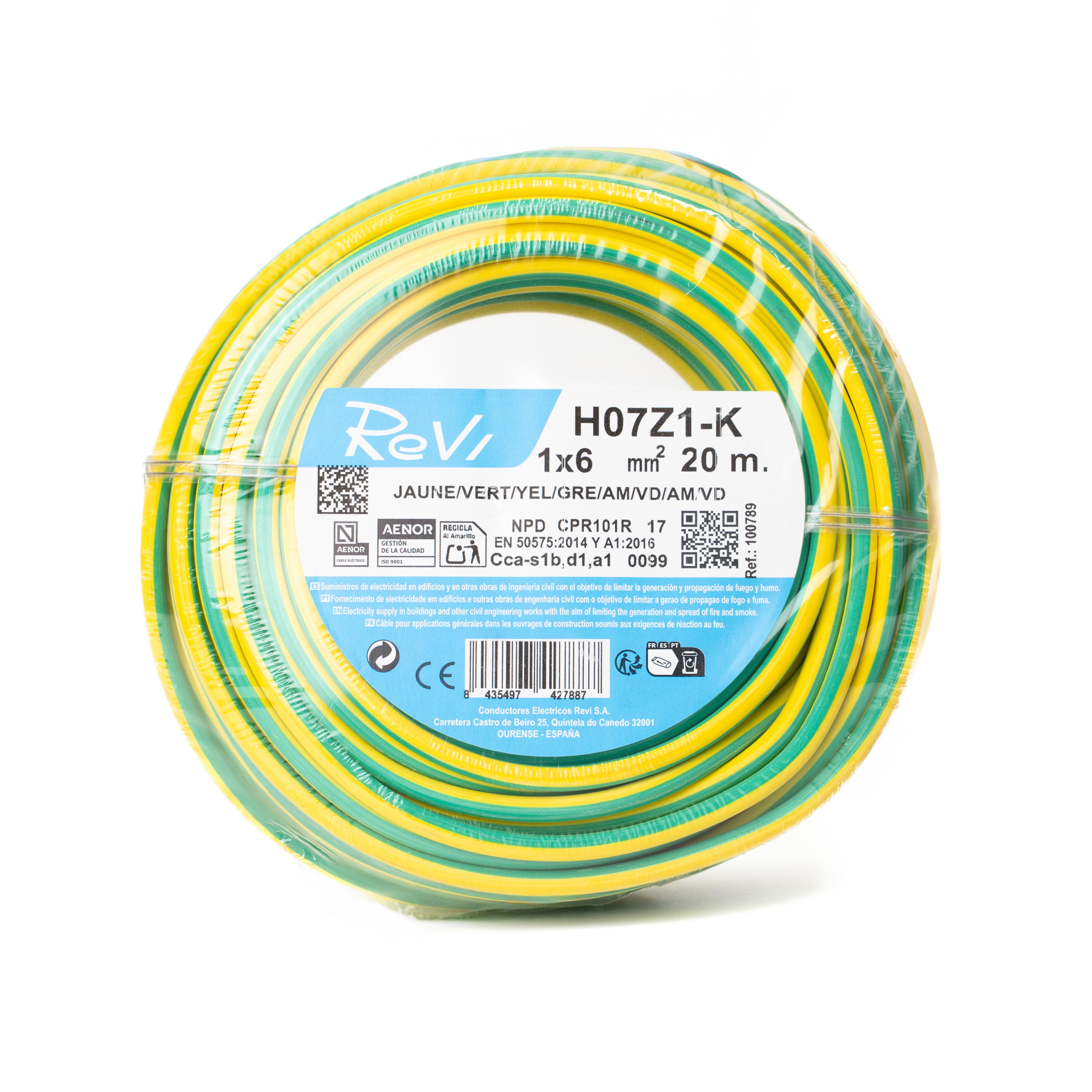 - Rollo de 20m hilo flexible LH H07Z1-K 6mm² con aislamiento tipo T17 según UNE-EN 50363-7 de color verde / amarillo.
