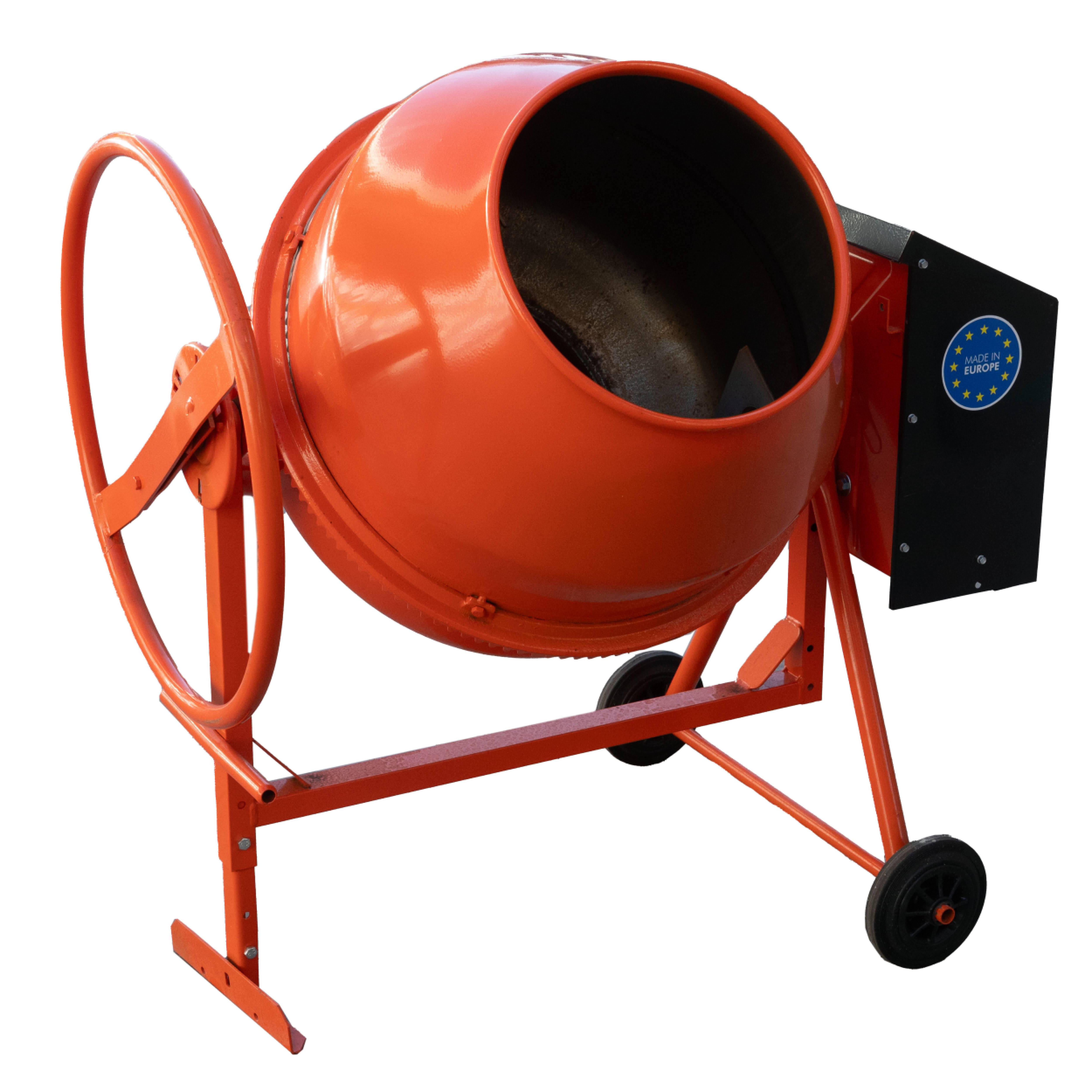 Hormigonera eléctrica 125l 0,95cv con protección IP54 y peso de 49kg, con capacidad de mezcla 100l, modelo Premix 135, con ruedas de goma, estructura reforzada y corona de fundición.