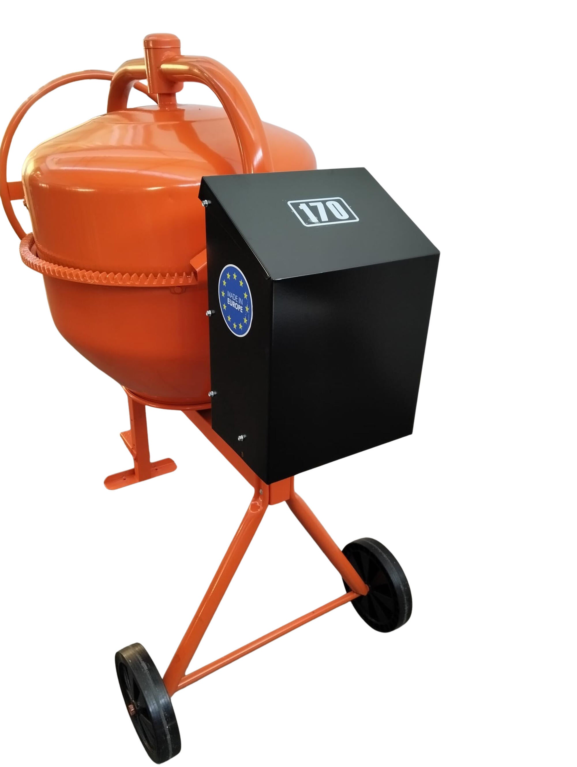 Hormigonera eléctrica 140l 0,95cv con protección IP54 y peso de 62kg, con capacidad de mezcla 140l, modelo Premix 170, con ruedas de goma, estructura reforzada y corona de fundición.
