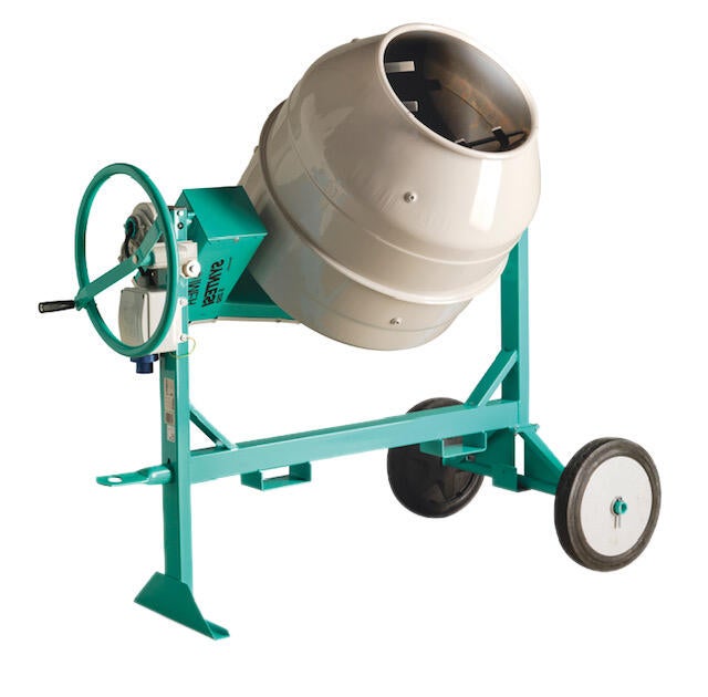 Hormigonera eléctrica 190l 1,50cv con protección IP55 y peso de 106kg, con capacidad de mezcla de 160l, modelo Syntesi 190, con ruedas de goma, estructura reforzada y corona de fundición.