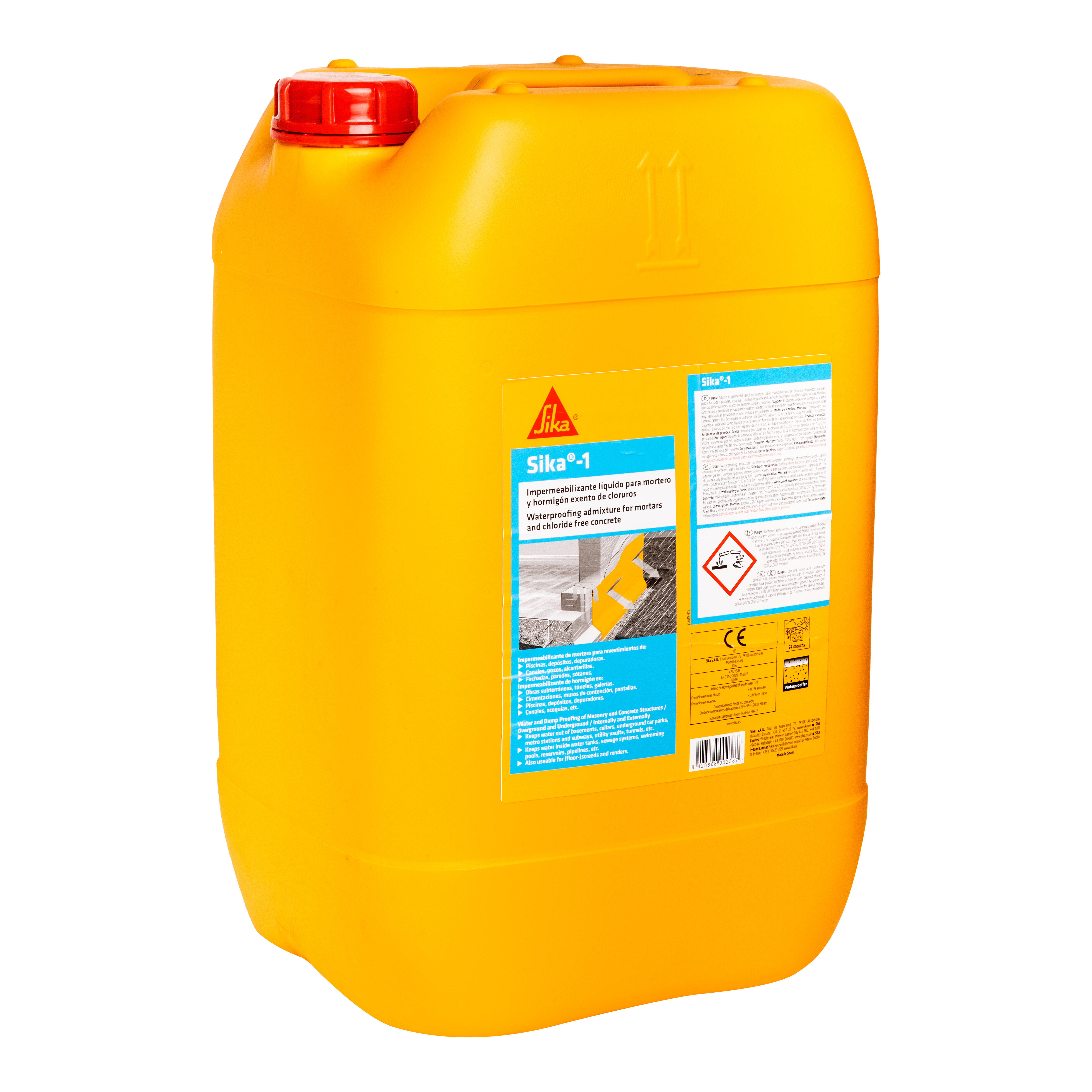 Aditivo impermeabilizante líquido SIKA-1 25 KG para mortero y hormigón exento de cloruros. Usos: Para morteros y hormigones en piscinas, depósitos, depuradoras, canales, pozos, fachadas, paredes, sótanos..