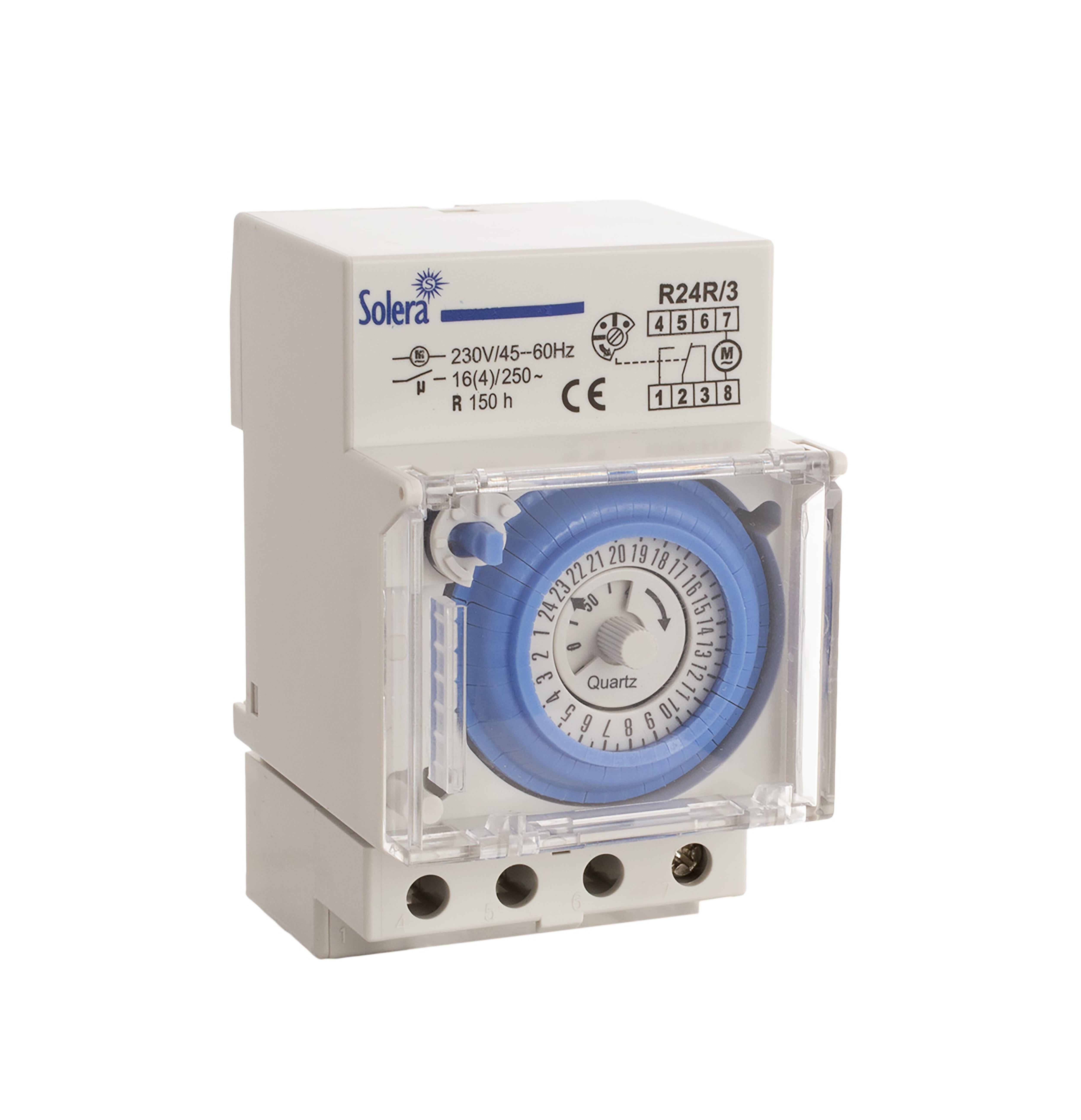Interruptor horario 24 h. Analógico. 230vac~. Tres módulos. Con reserva. (150h) Función: on-off-timer. Unidad mínima de tiempo: 15 m. Contacto: 1no (16A)