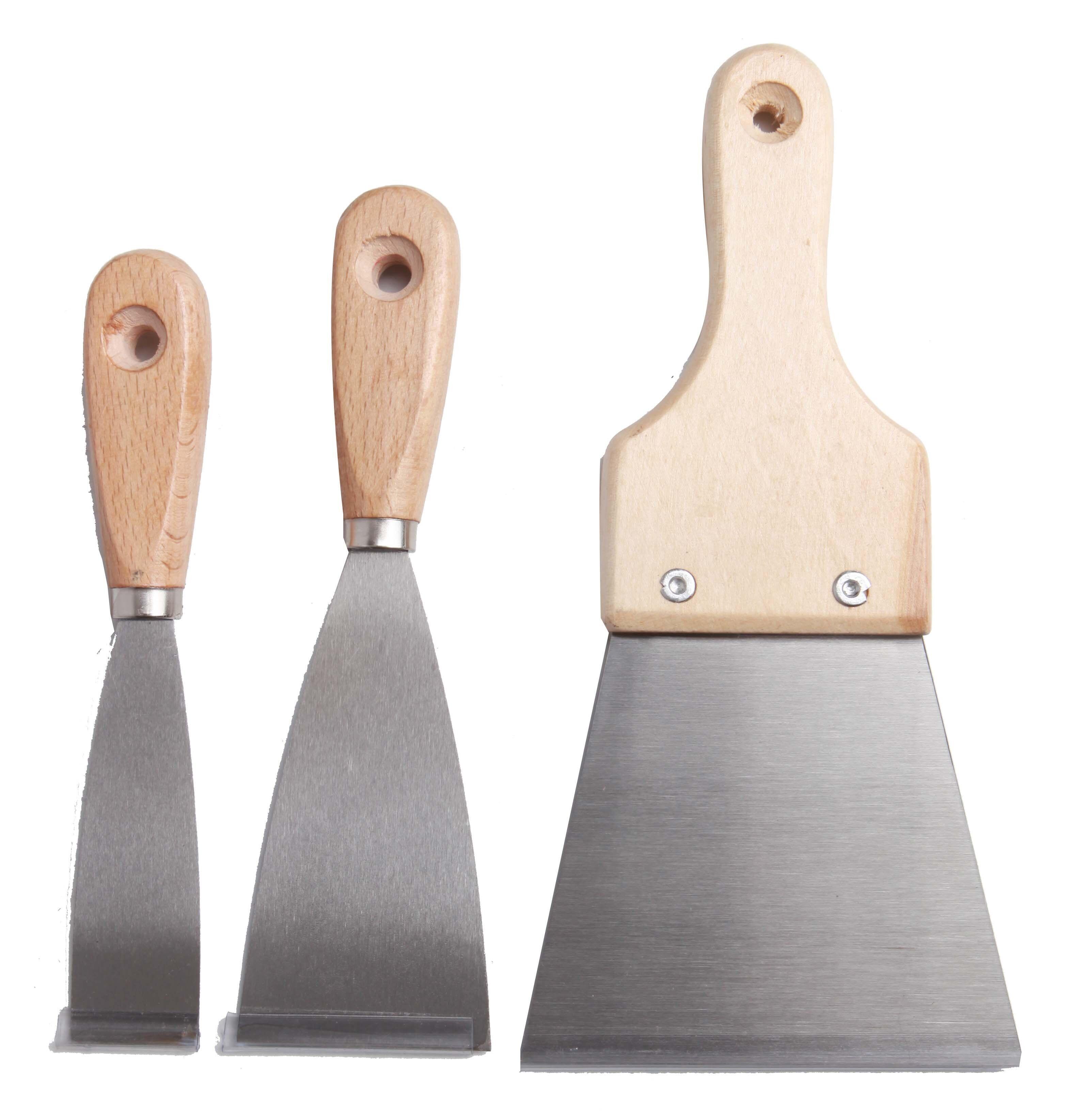 Juego de 3 espátulas con mango de madera. Hoja de acero al carbono. Espesor 0.5mm