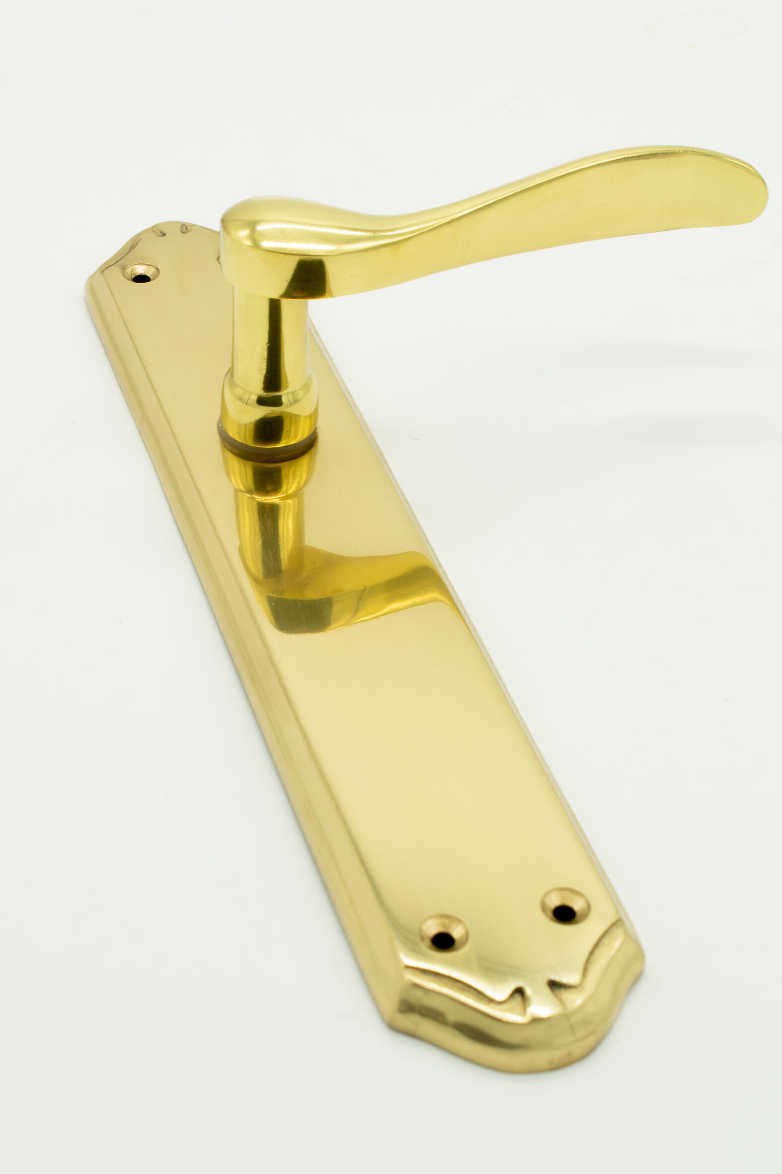 Juego de manilla o manivela para puerta interior con placa lisa o ciega realizada en latón y con acabado latón pulido brillo. Mod 2000