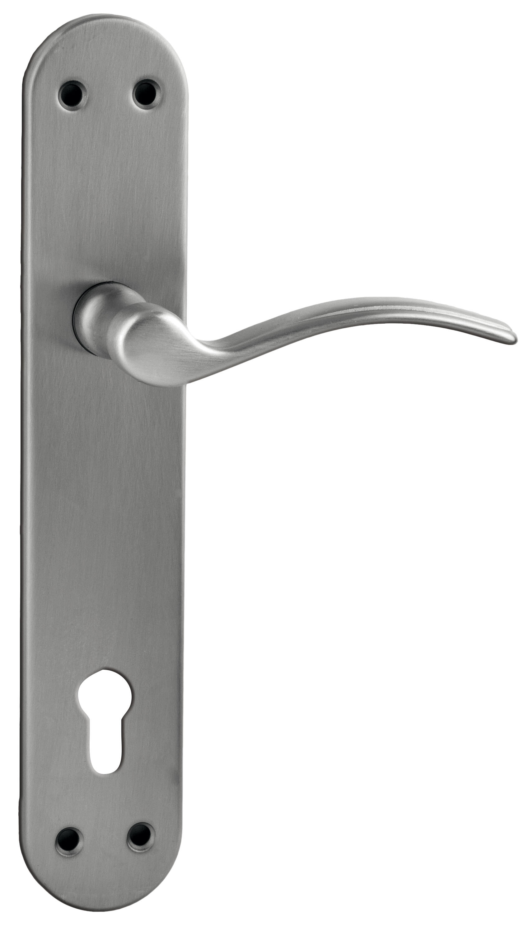 Juego de manillas para puerta interior con placa y bocallave de 47 mm, realizadas en aluminio con acabado níquel satinado. Mod LISA