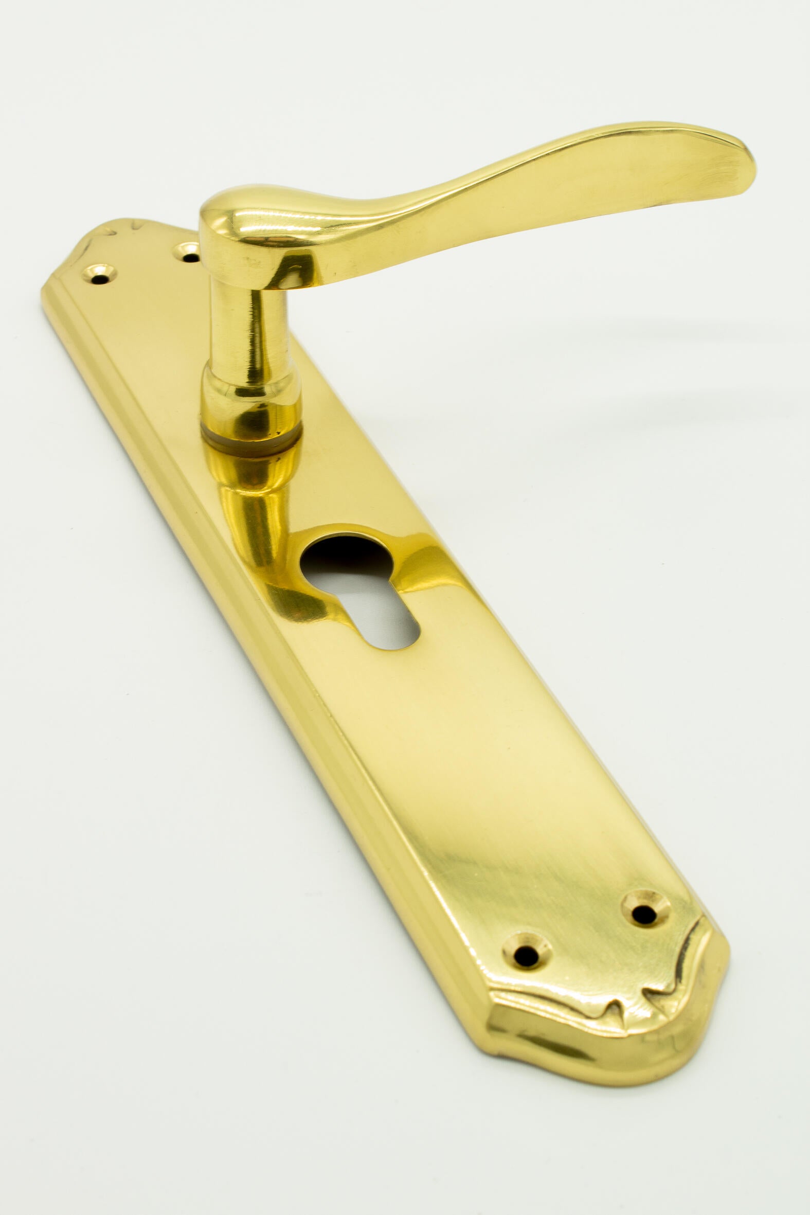 Juego de manilla o manivela para puerta interior con bocallave de 47 mm realizada en latón y con acabado latón pulido brillo. Mod 2000