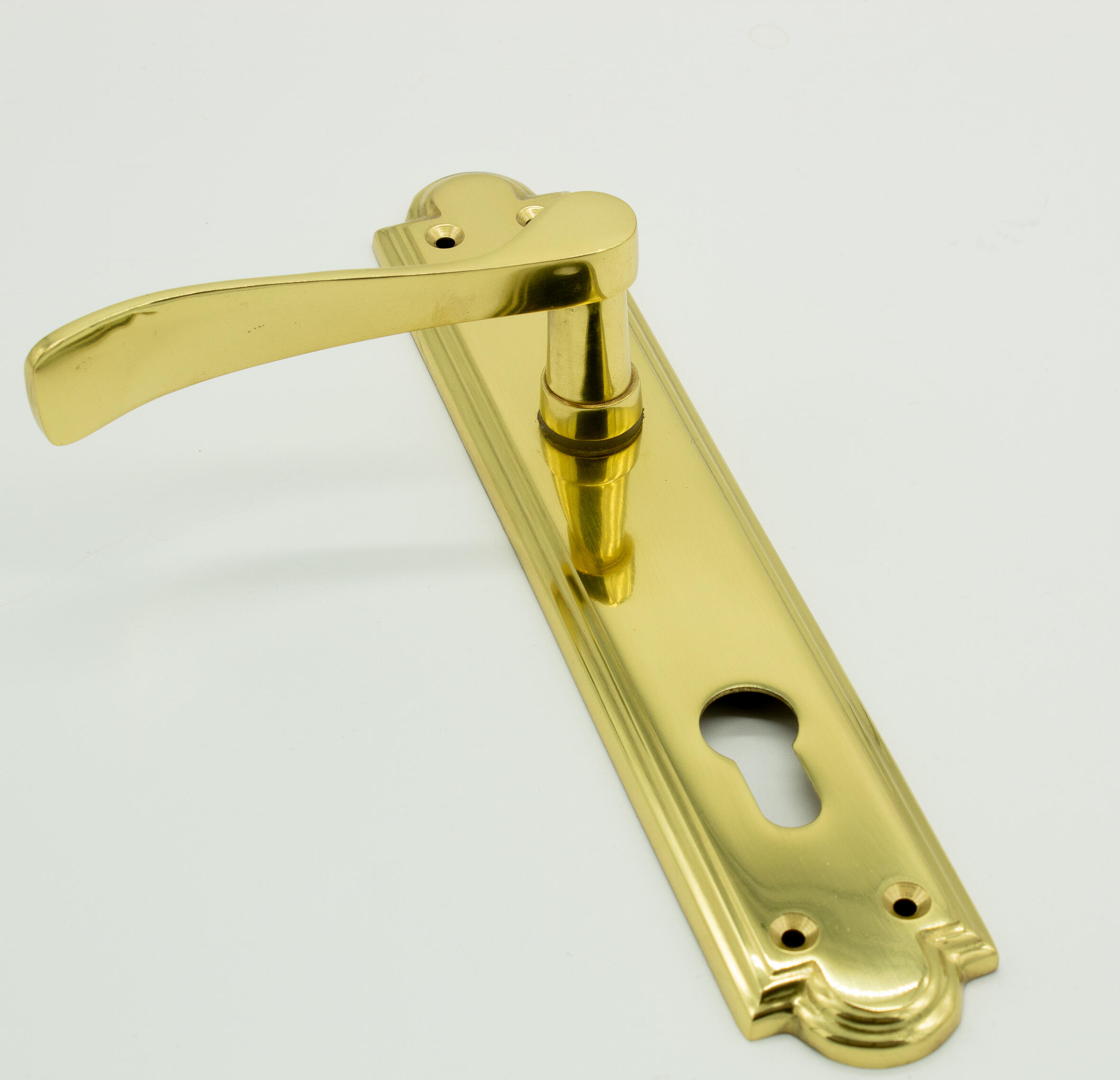 Juego de manivela o manilla para puerta interior con bocallave de 85 mm realizada en latón y con acabado latón pulido brillo. Mod 1000