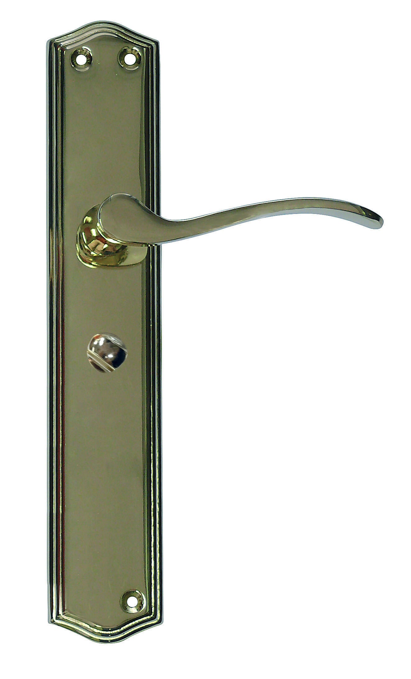 Juego de manilla para puerta interior con placa y muletilla de 47 mm realizada en hierro y acabado latonado