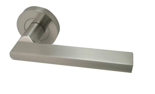 Juego de manillas con roseta para puerta, realizada en aluminio con acabado níquel satinado con un diámetro de 52 mm, manilla recta y cuadrada